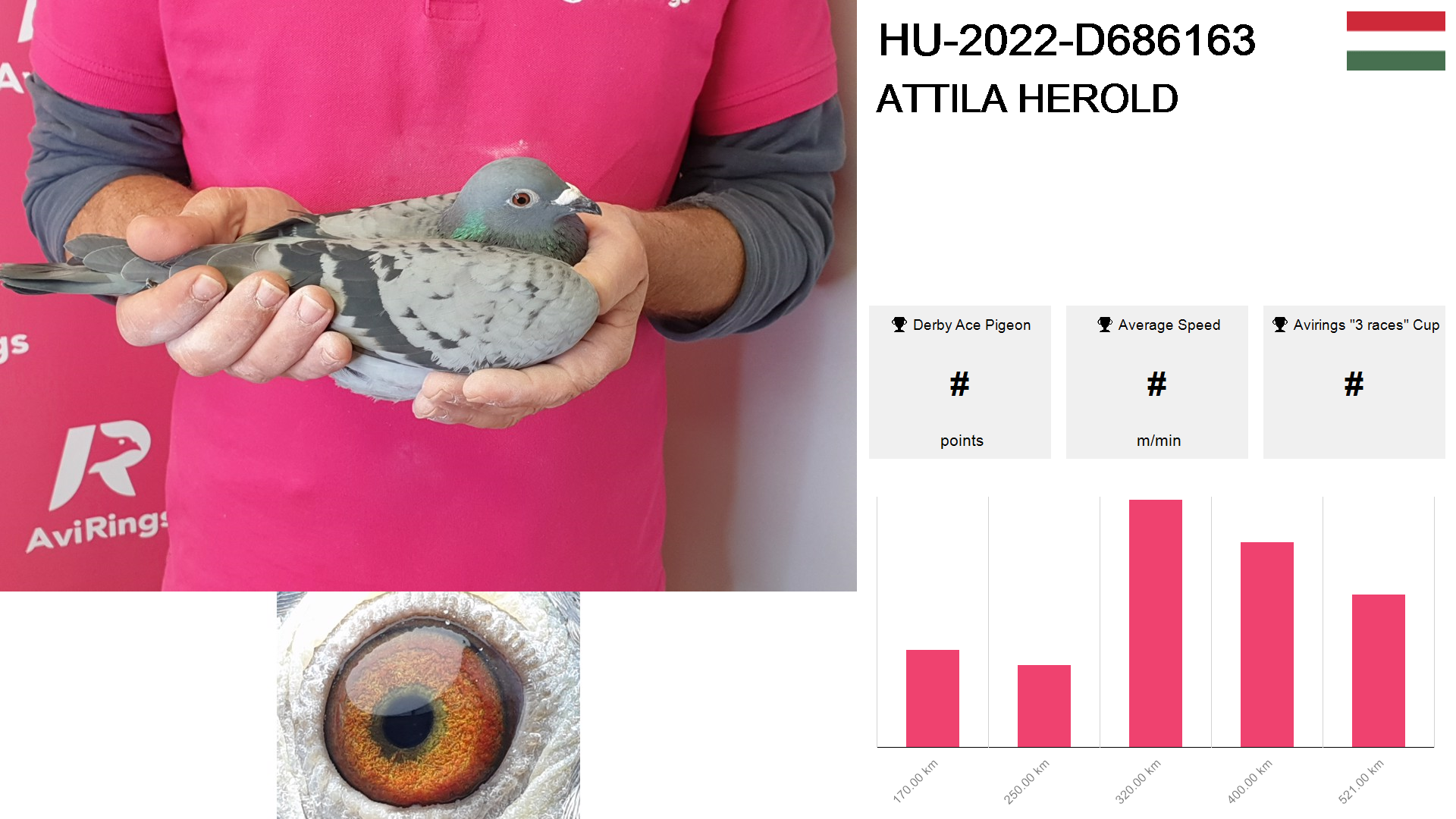 | Race | Position | Number of pigeons | Percent | Speed | Distance |