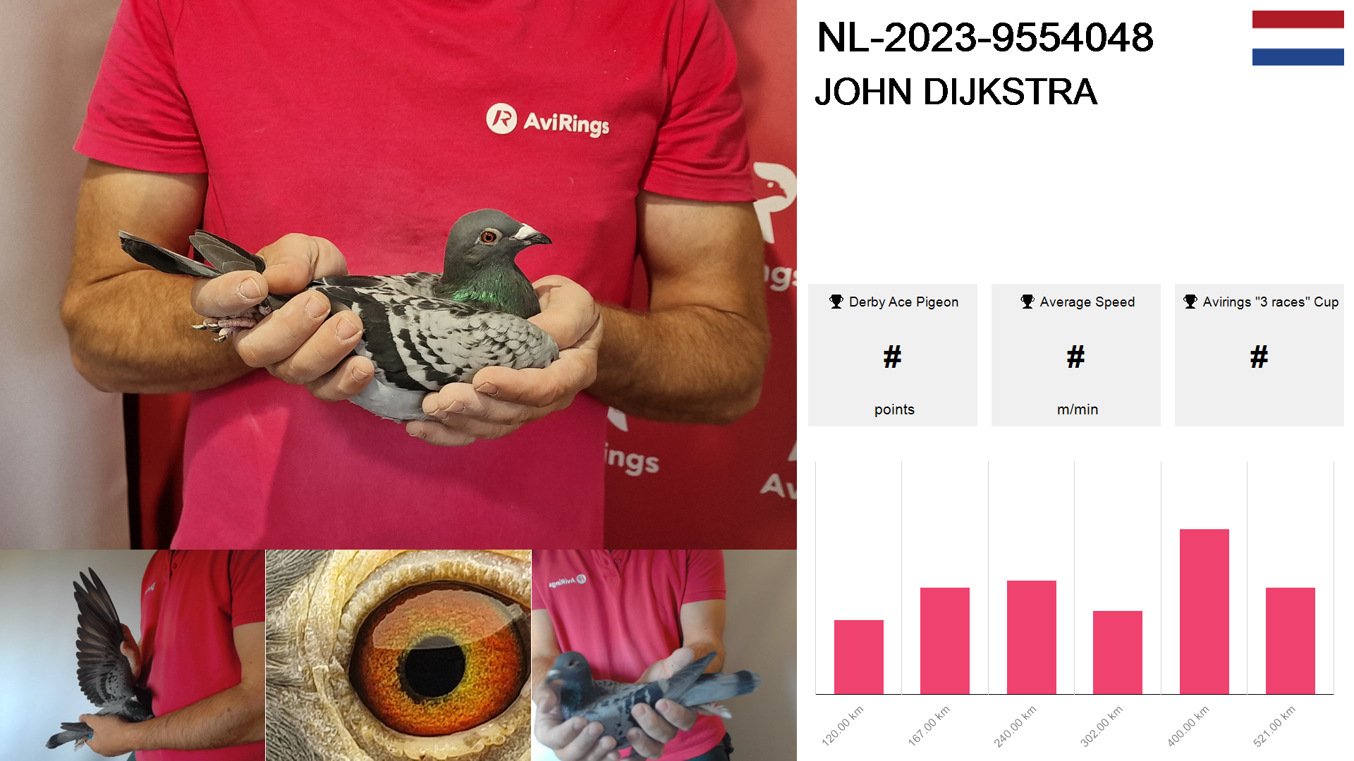 | Race | Position | Number of pigeons | Percent | Speed | Distance |