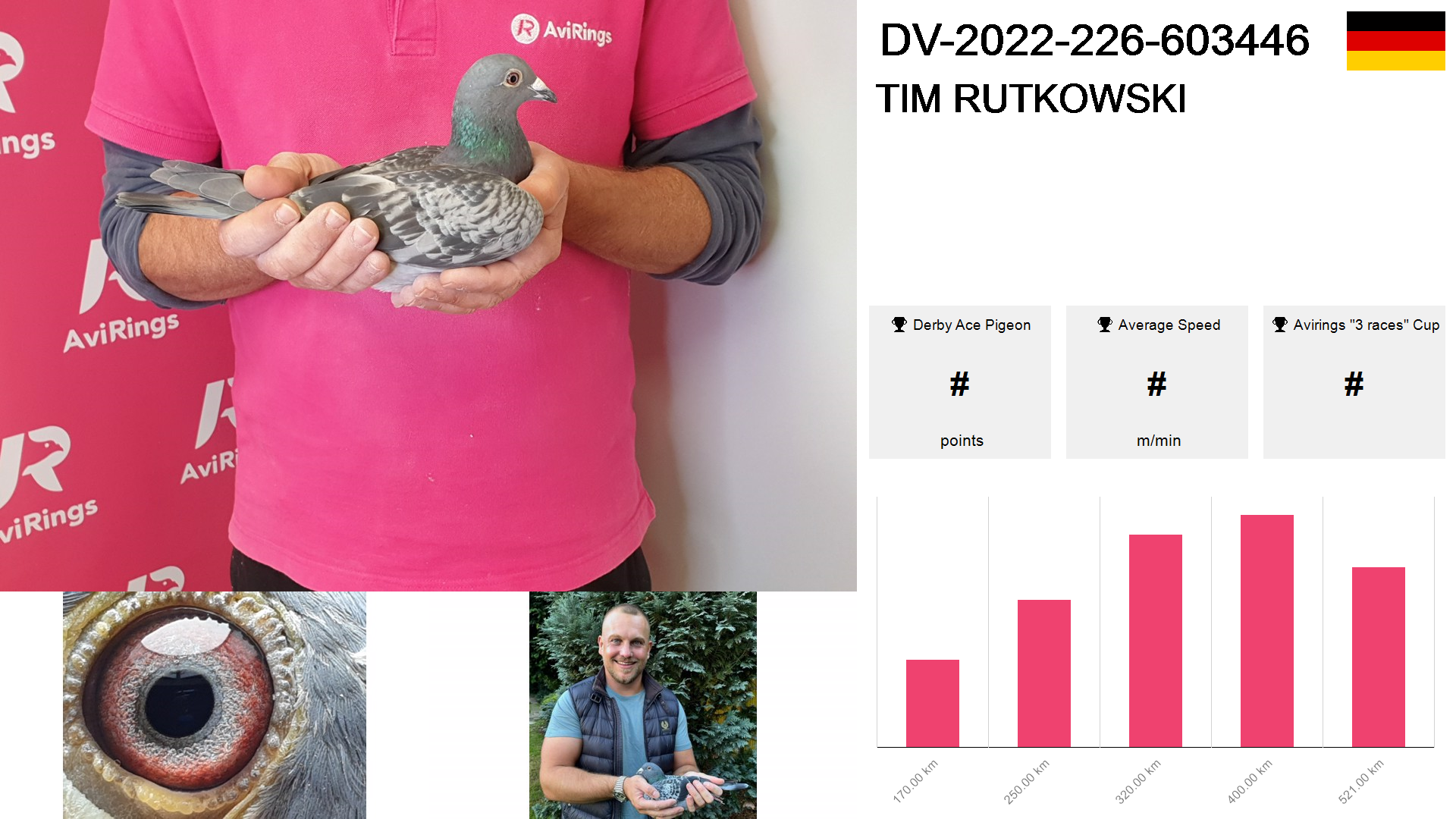 | Race | Position | Number of pigeons | Percent | Speed | Distance |