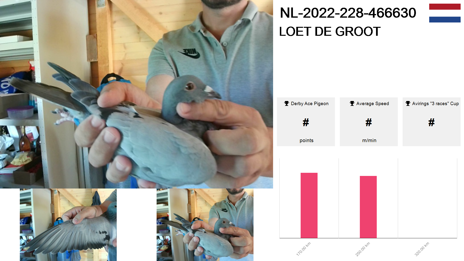 | Race | Position | Number of pigeons | Percent | Speed | Distance |