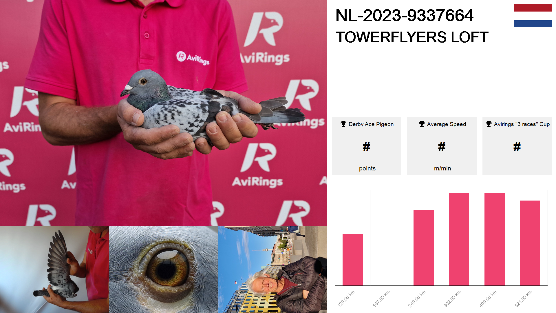 | Race | Position | Number of pigeons | Percent | Speed | Distance |