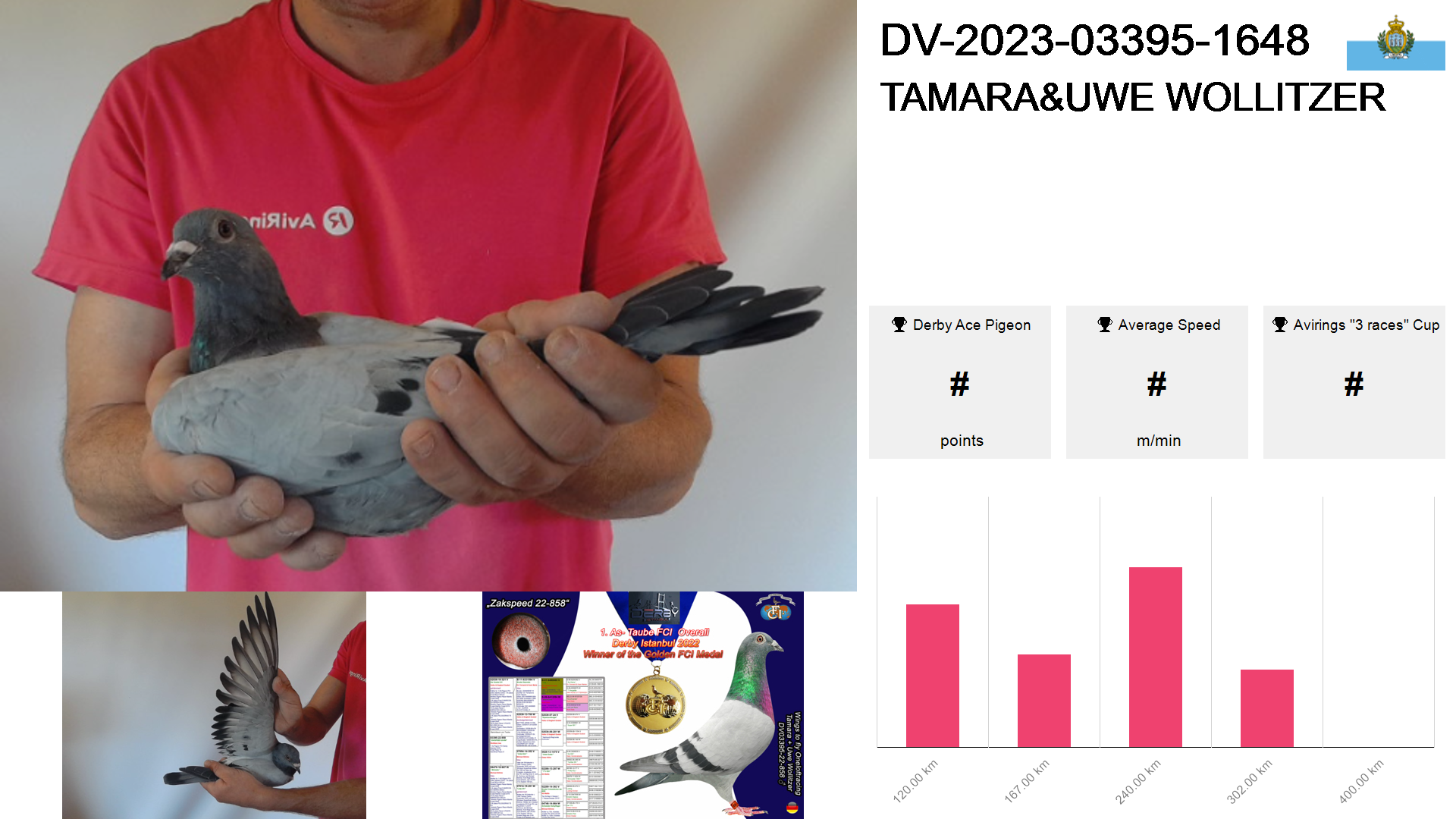 | Race | Position | Number of pigeons | Percent | Speed | Distance |