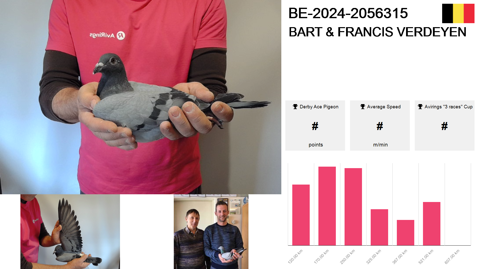 | Race | Position | Number of pigeons | Percent | Speed | Distance |