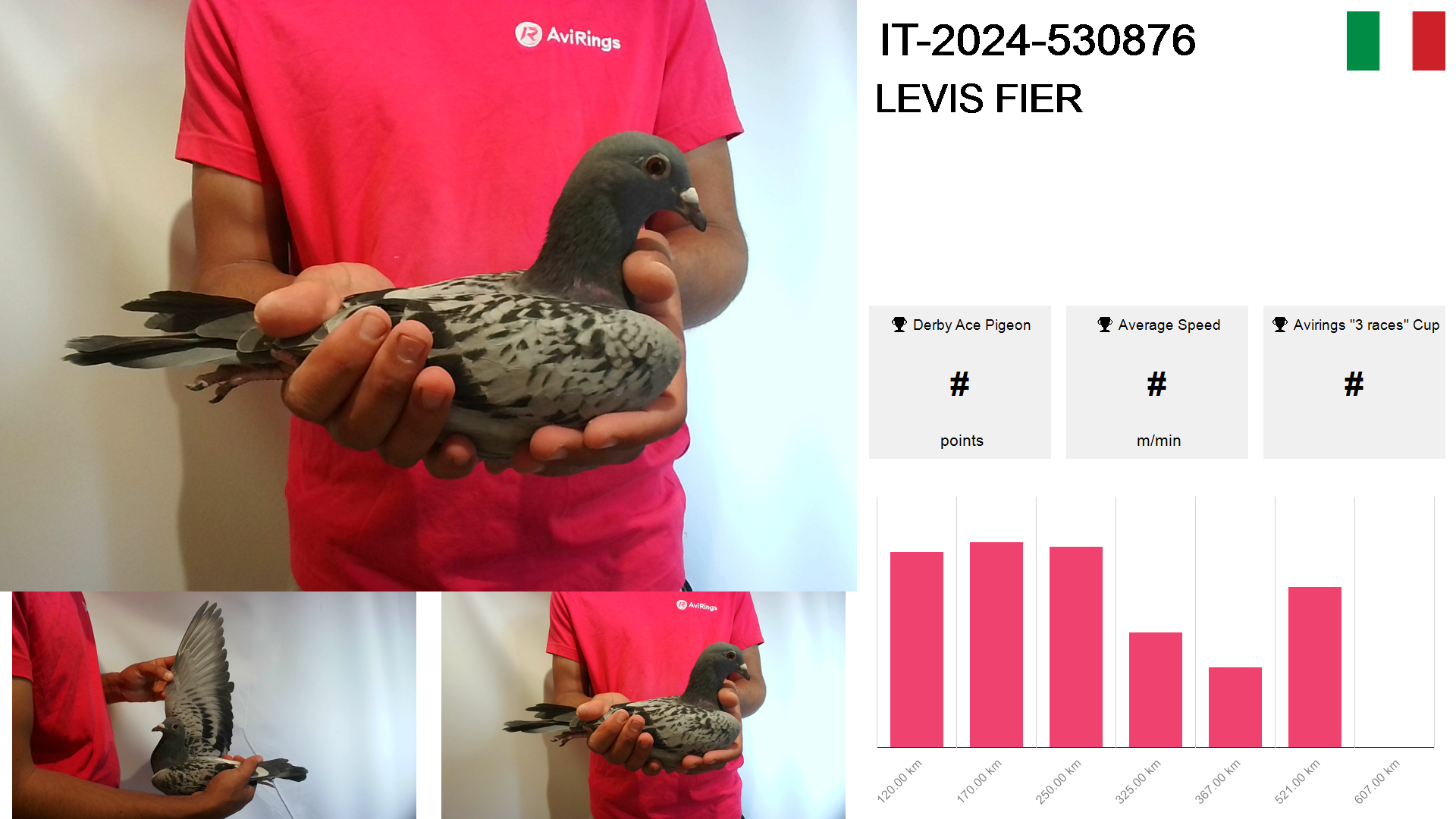| Race | Position | Number of pigeons | Percent | Speed | Distance |