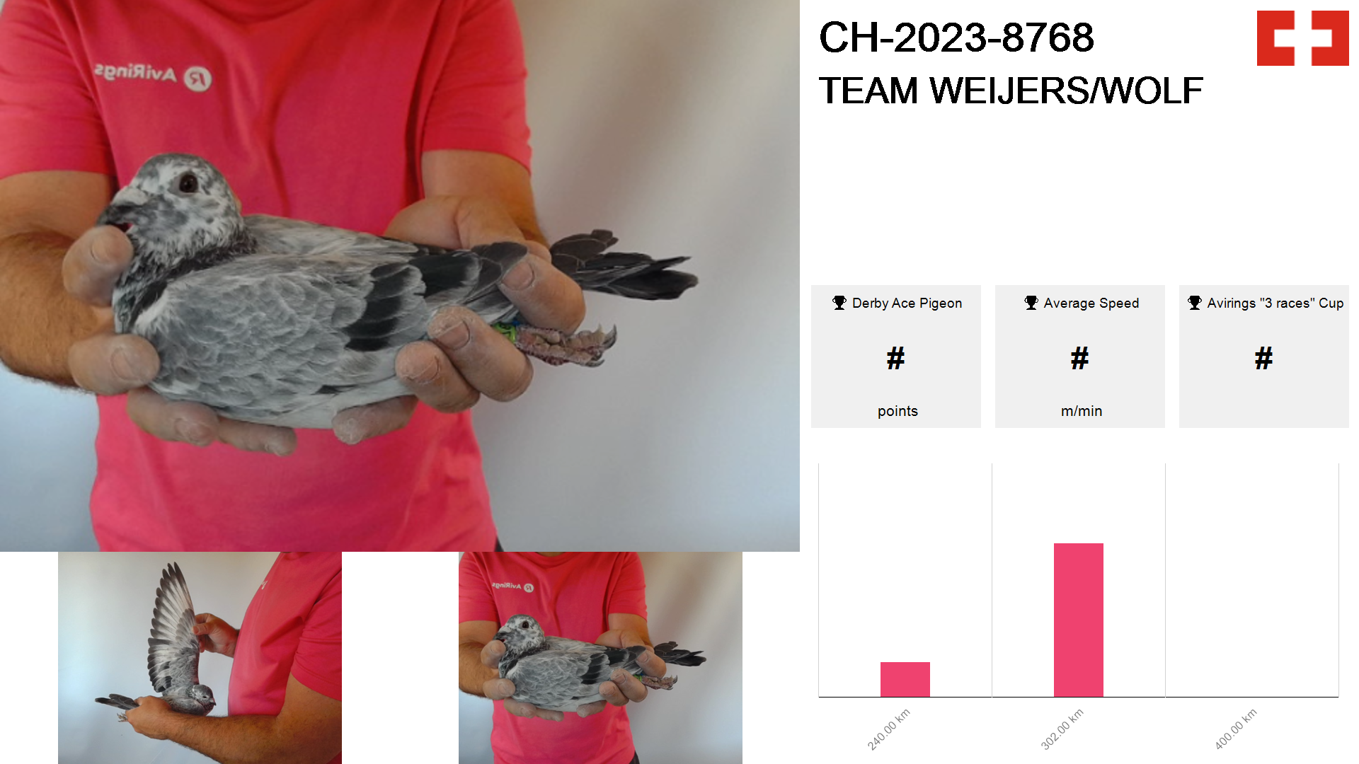 | Race | Position | Number of pigeons | Percent | Speed | Distance |