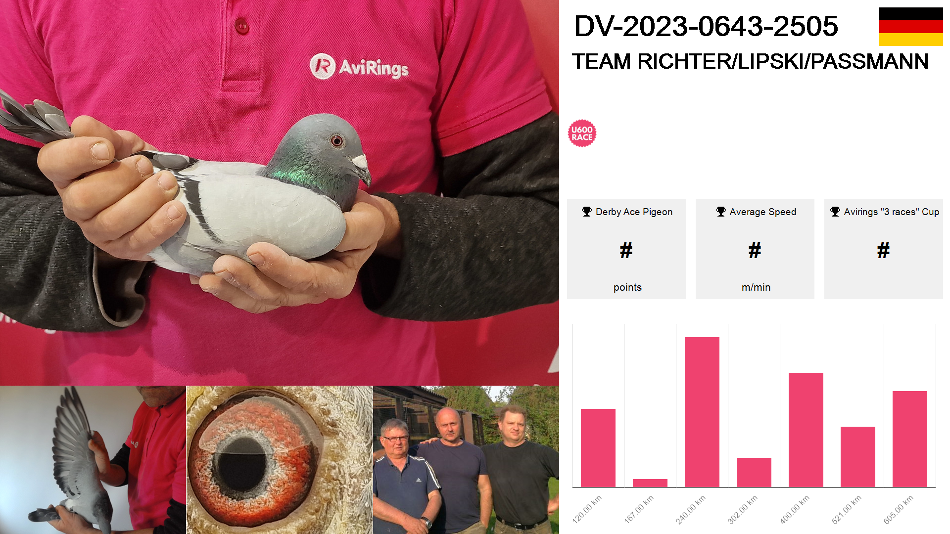 | Race | Position | Number of pigeons | Percent | Speed | Distance |
