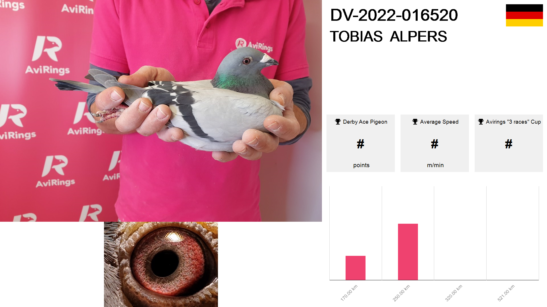 | Race | Position | Number of pigeons | Percent | Speed | Distance |