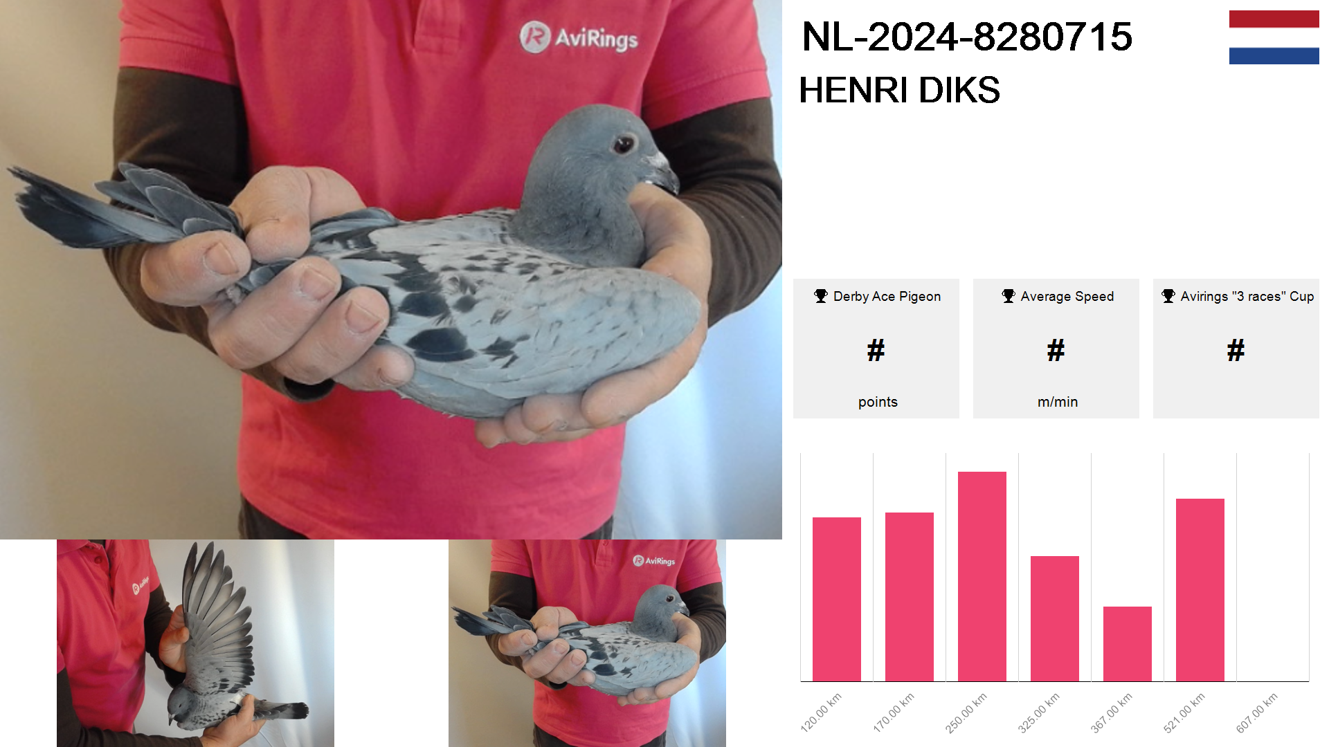 | Race | Position | Number of pigeons | Percent | Speed | Distance |