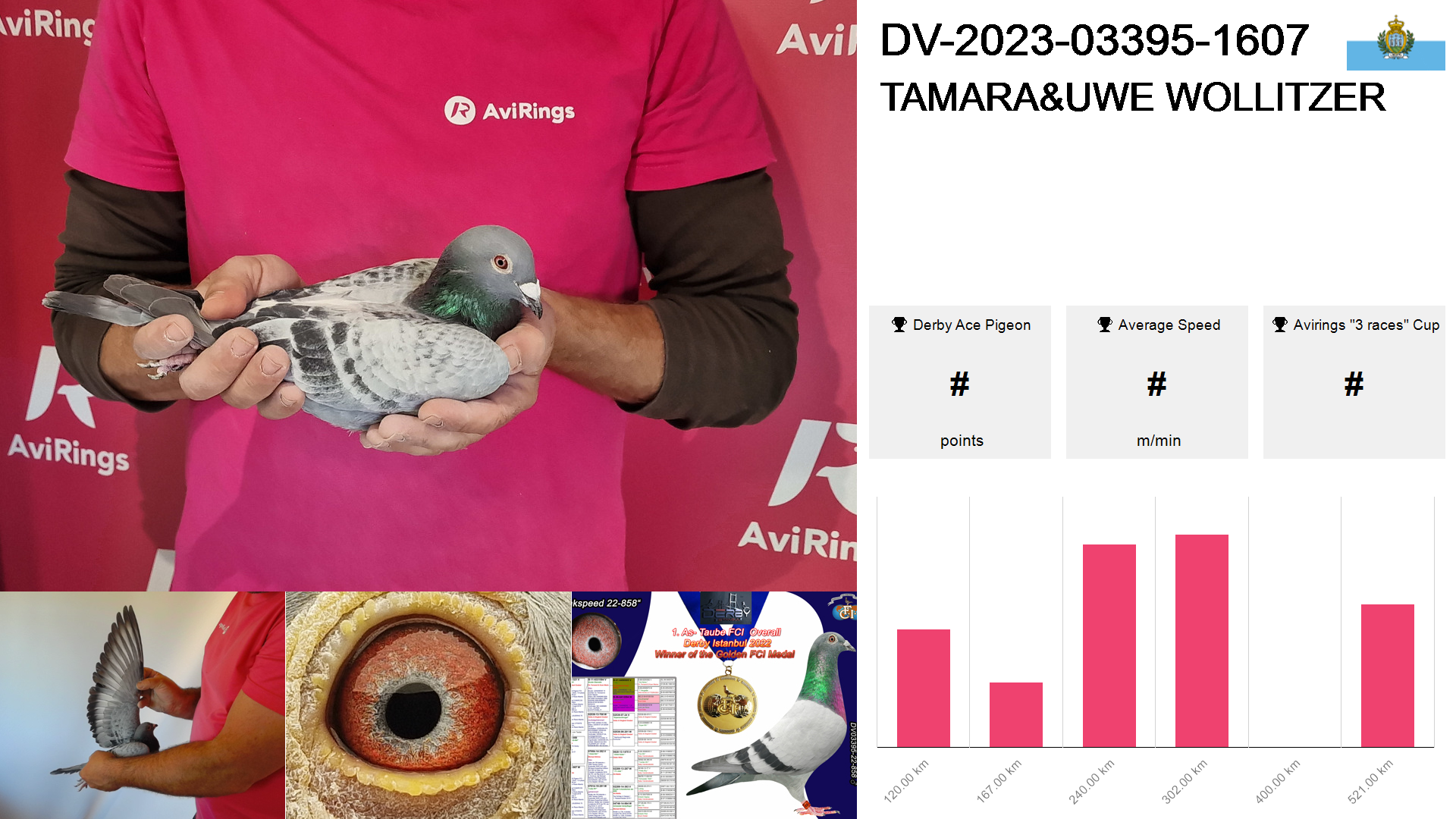 | Race | Position | Number of pigeons | Percent | Speed | Distance |