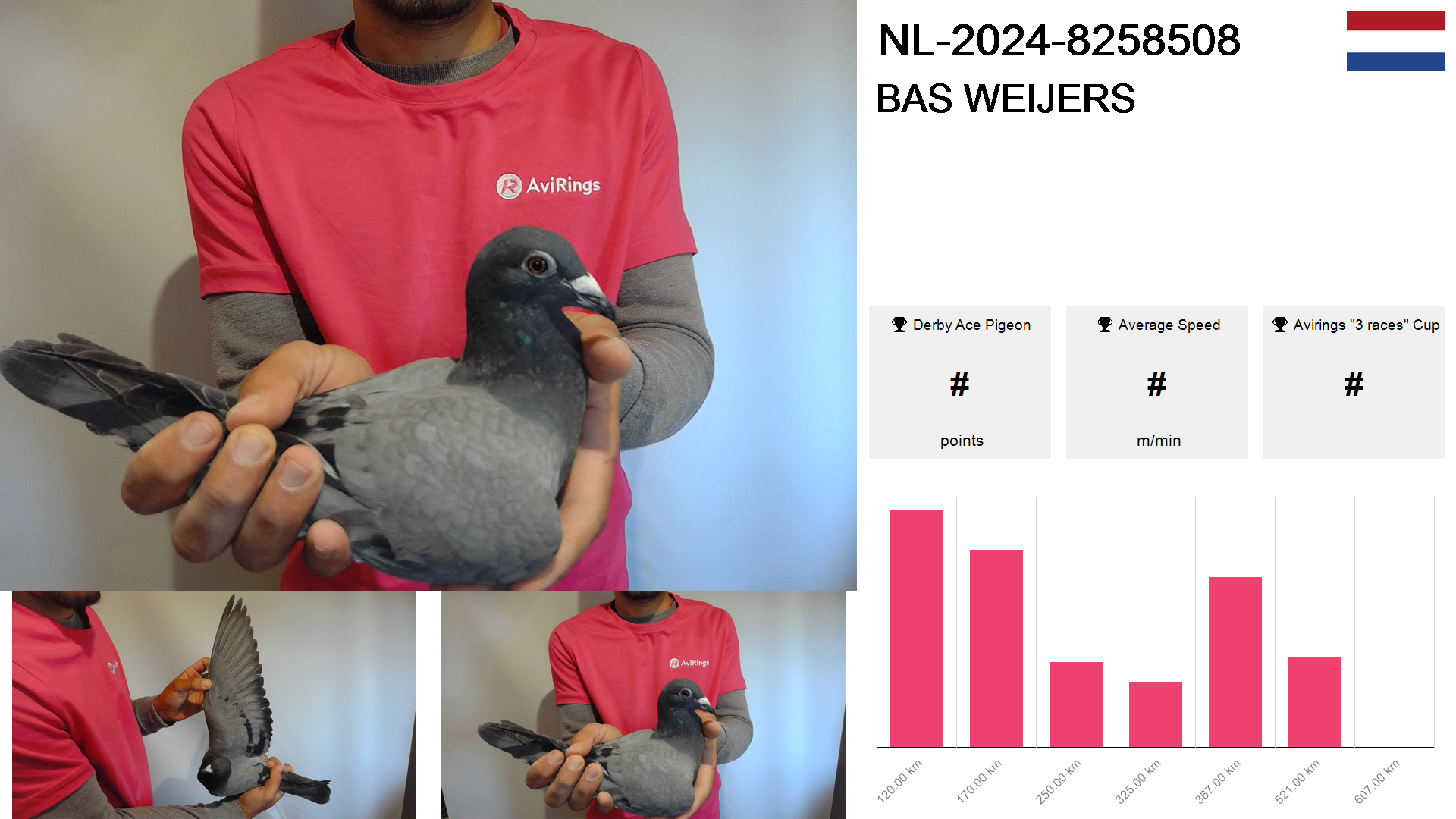 | Race | Position | Number of pigeons | Percent | Speed | Distance |