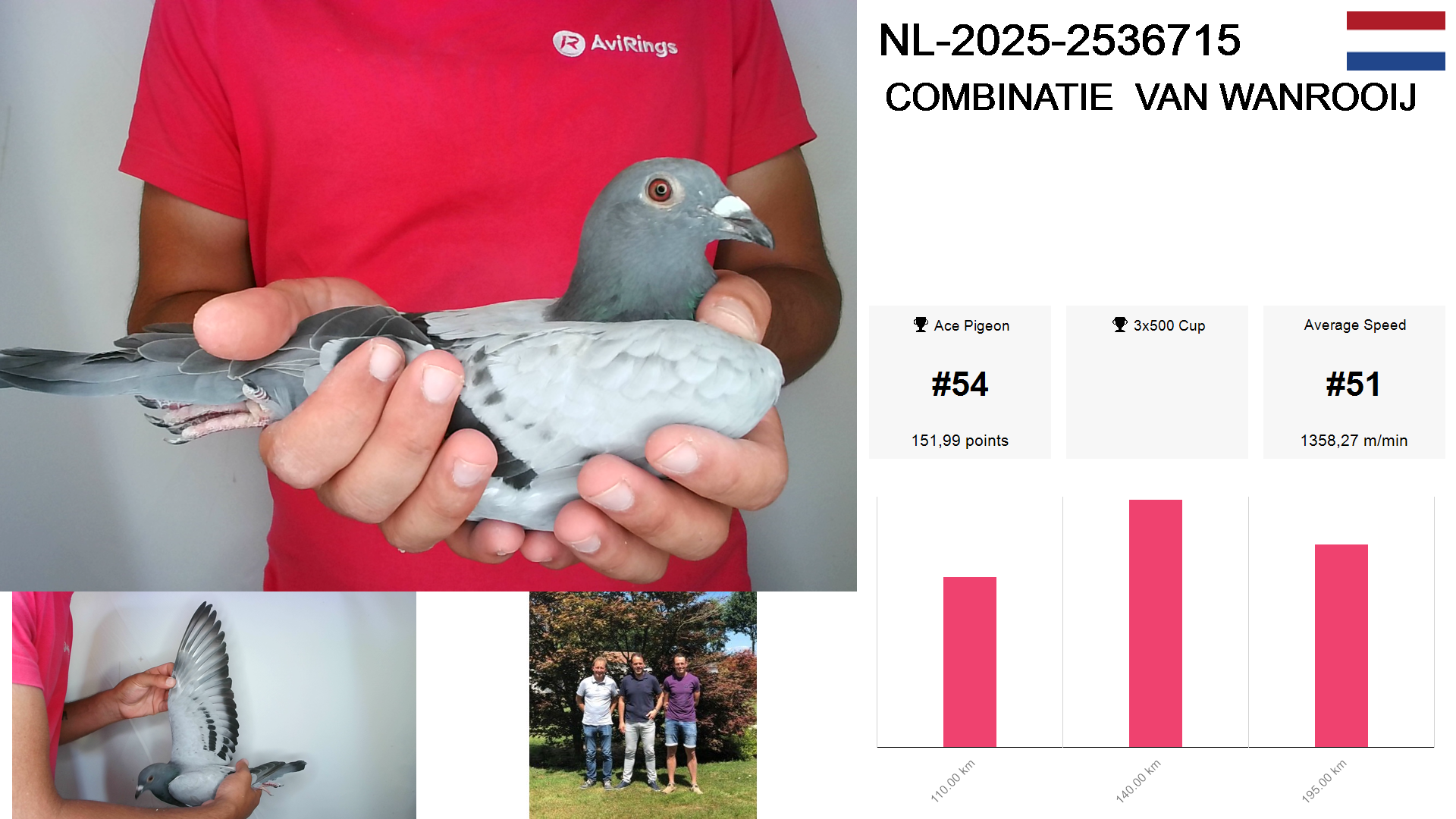 | Race | Position | Number of pigeons | Percent | Speed | Distance |