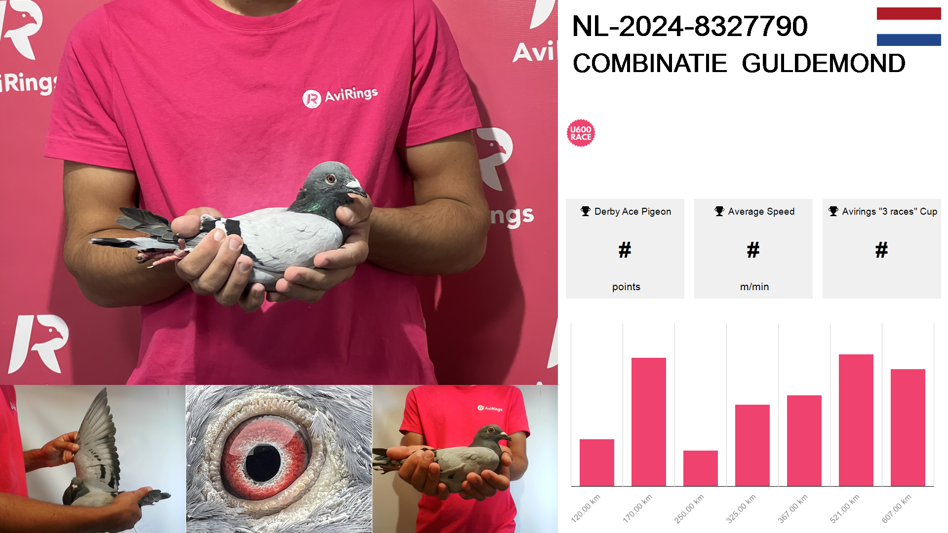 | Race | Position | Number of pigeons | Percent | Speed | Distance |
