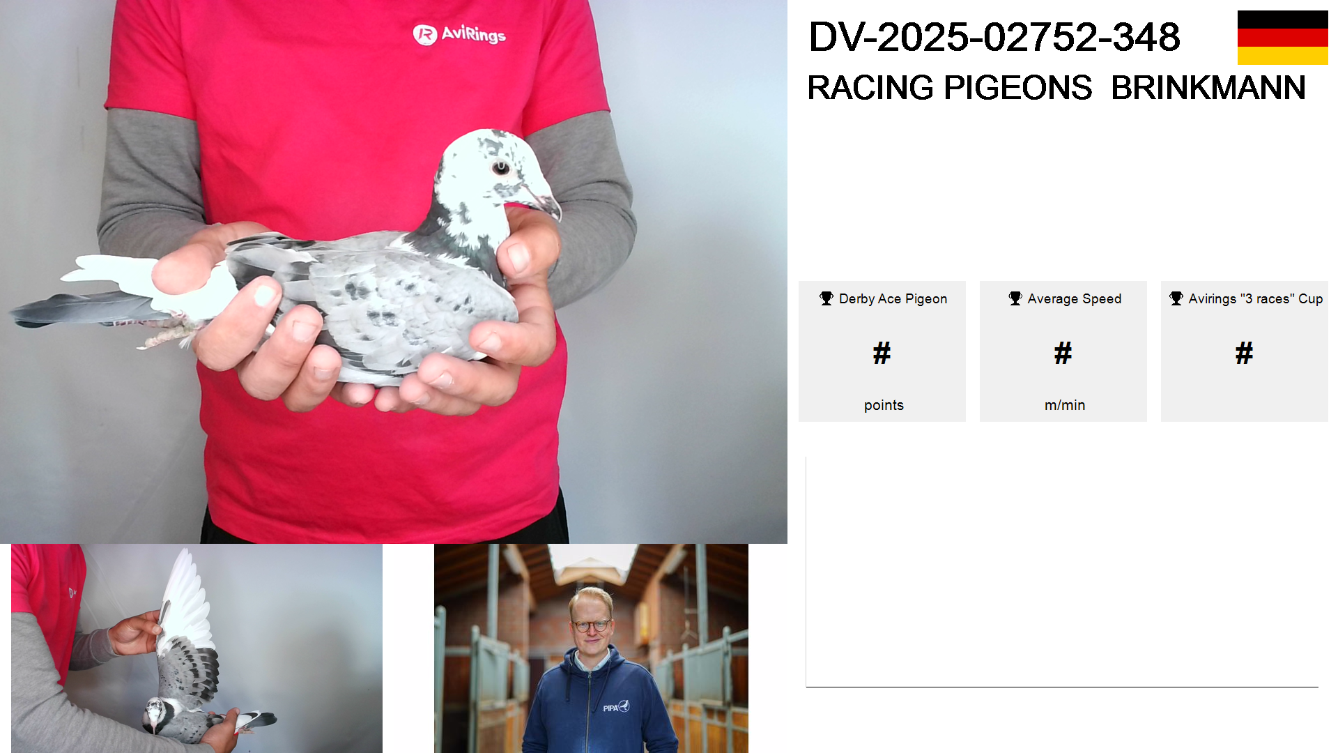 | Race | Position | Number of pigeons | Percent | Speed | Distance |