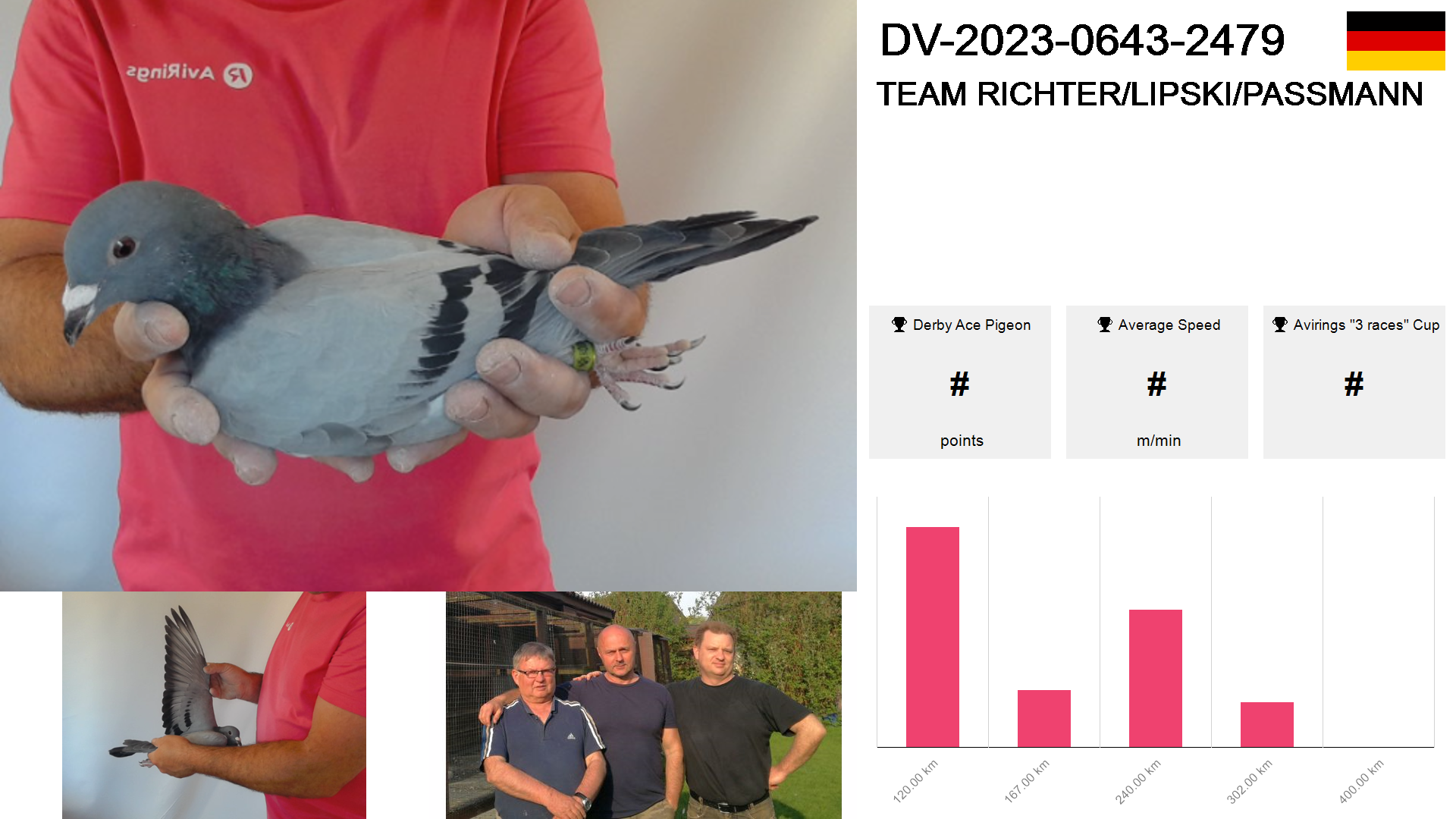| Race | Position | Number of pigeons | Percent | Speed | Distance |