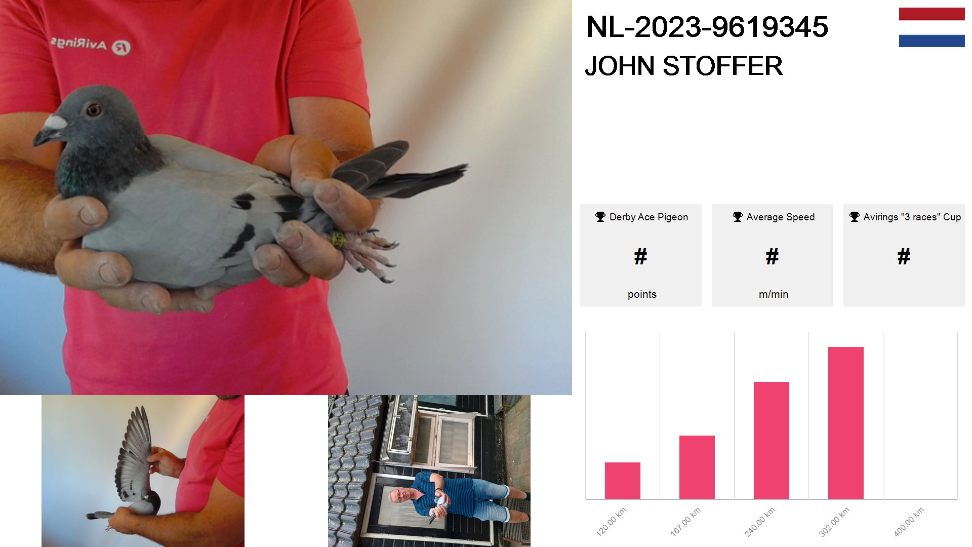 | Race | Position | Number of pigeons | Percent | Speed | Distance |