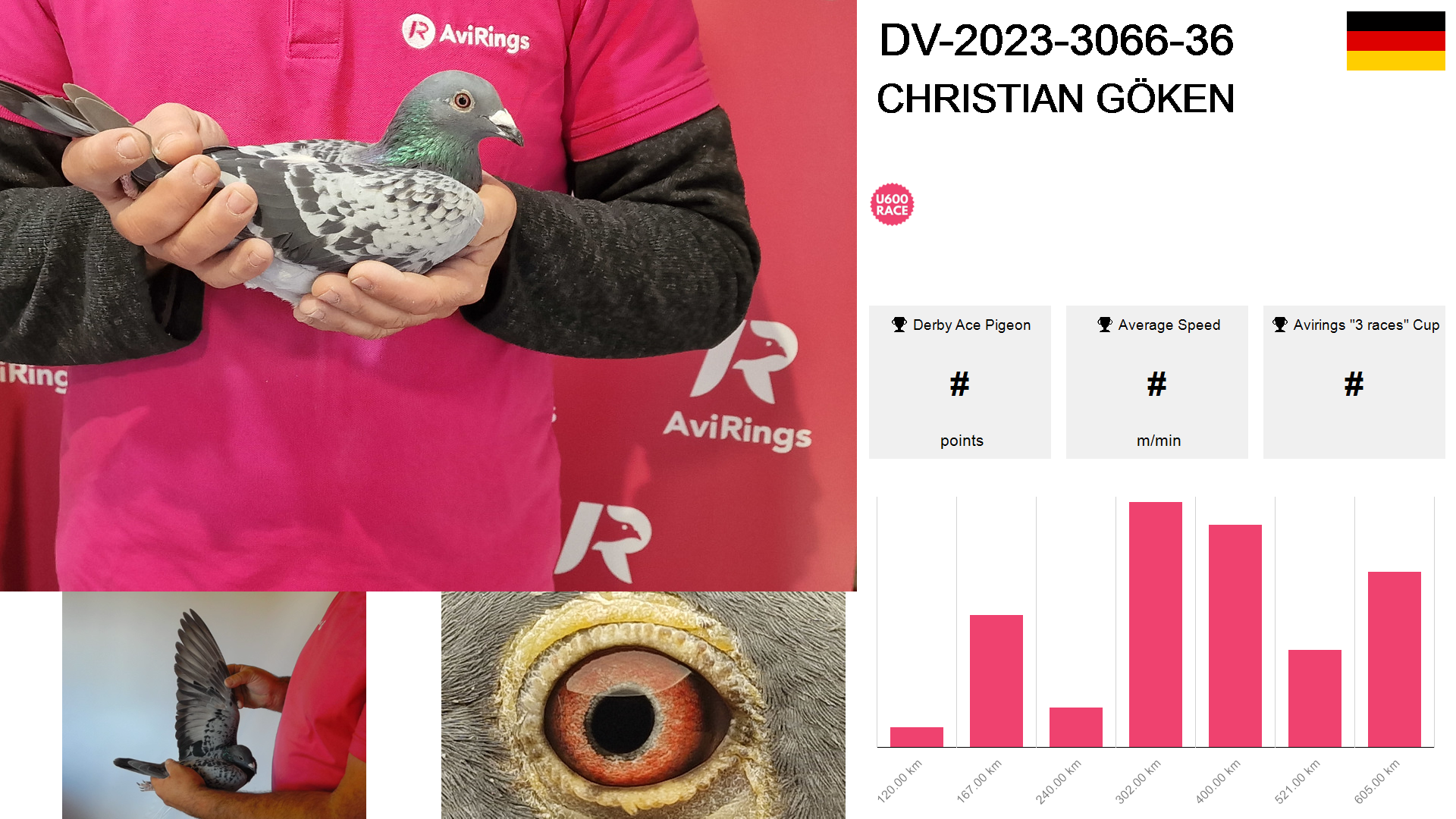 | Race | Position | Number of pigeons | Percent | Speed | Distance |
