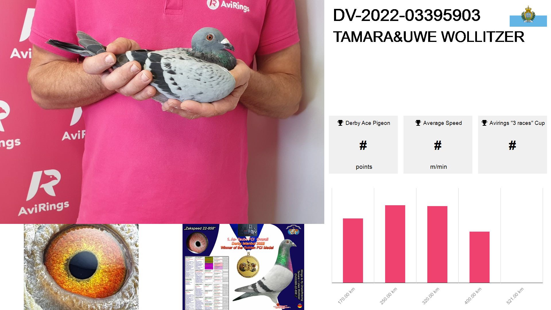| Race | Position | Number of pigeons | Percent | Speed | Distance |