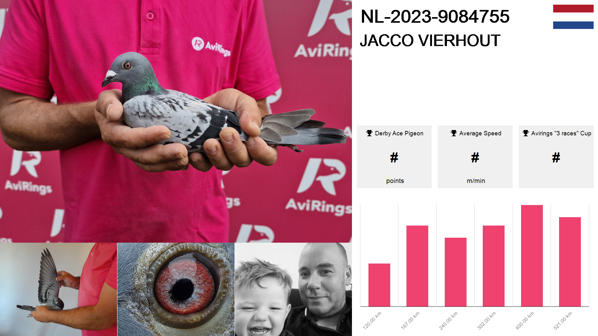 | Race | Position | Number of pigeons | Percent | Speed | Distance |