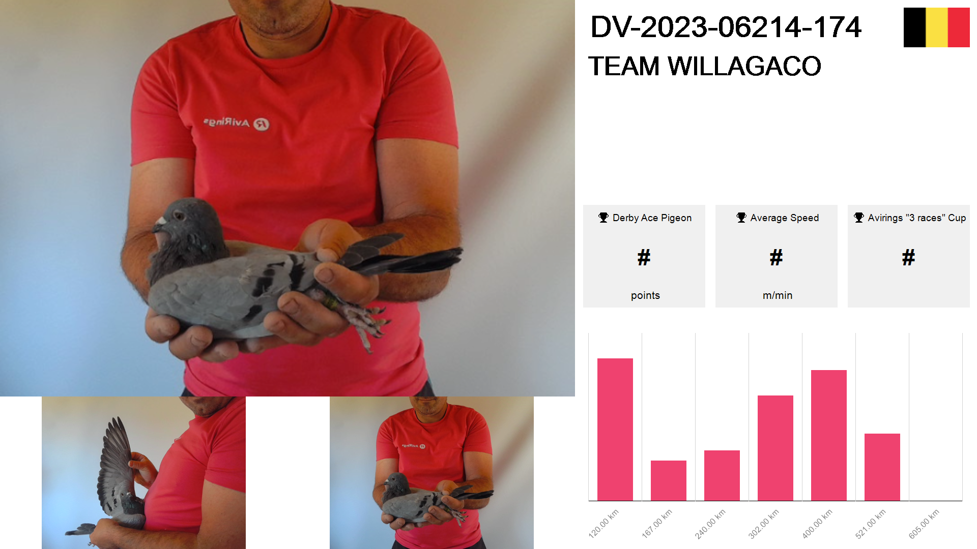 | Race | Position | Number of pigeons | Percent | Speed | Distance |