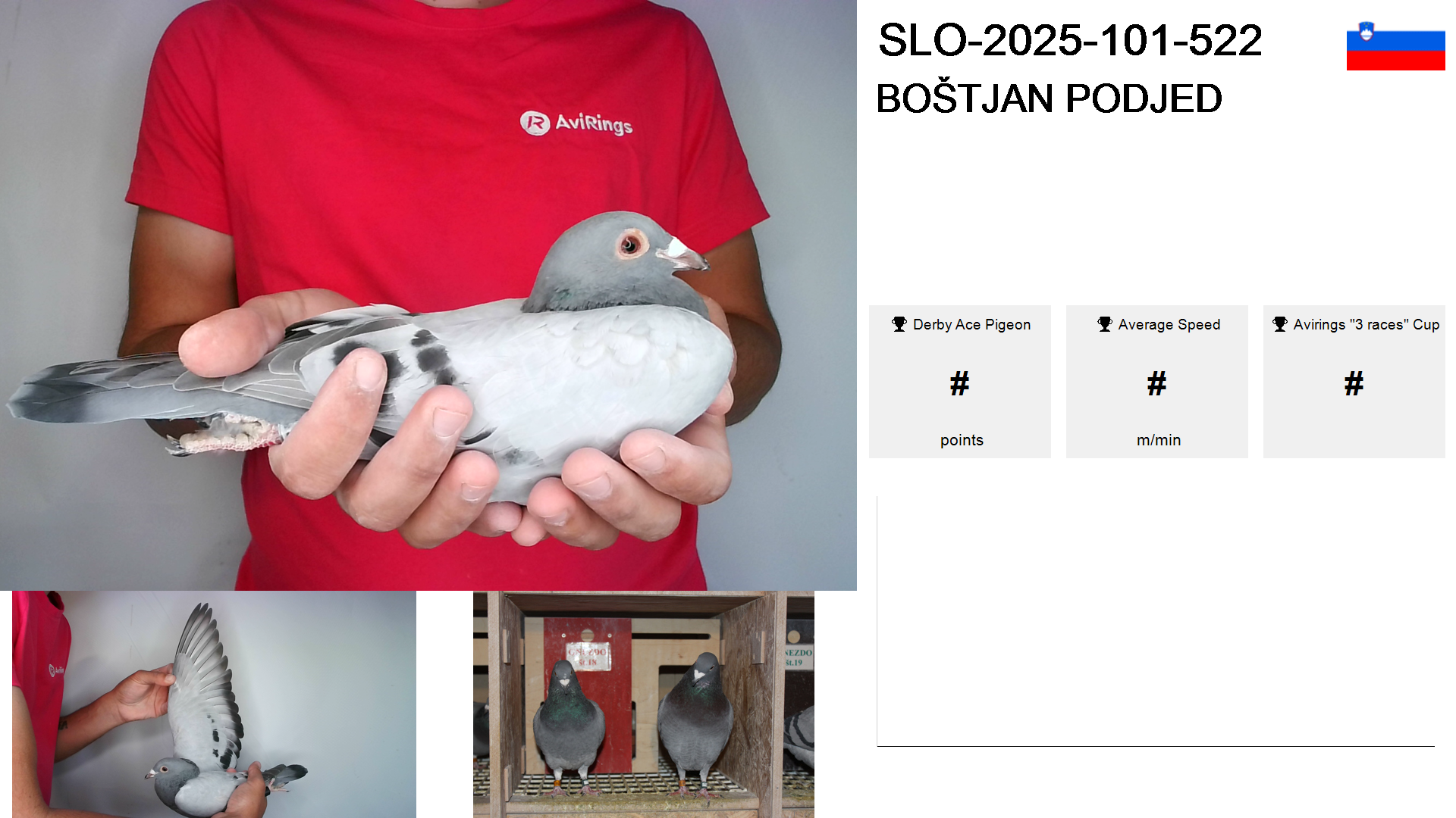 | Race | Position | Number of pigeons | Percent | Speed | Distance |