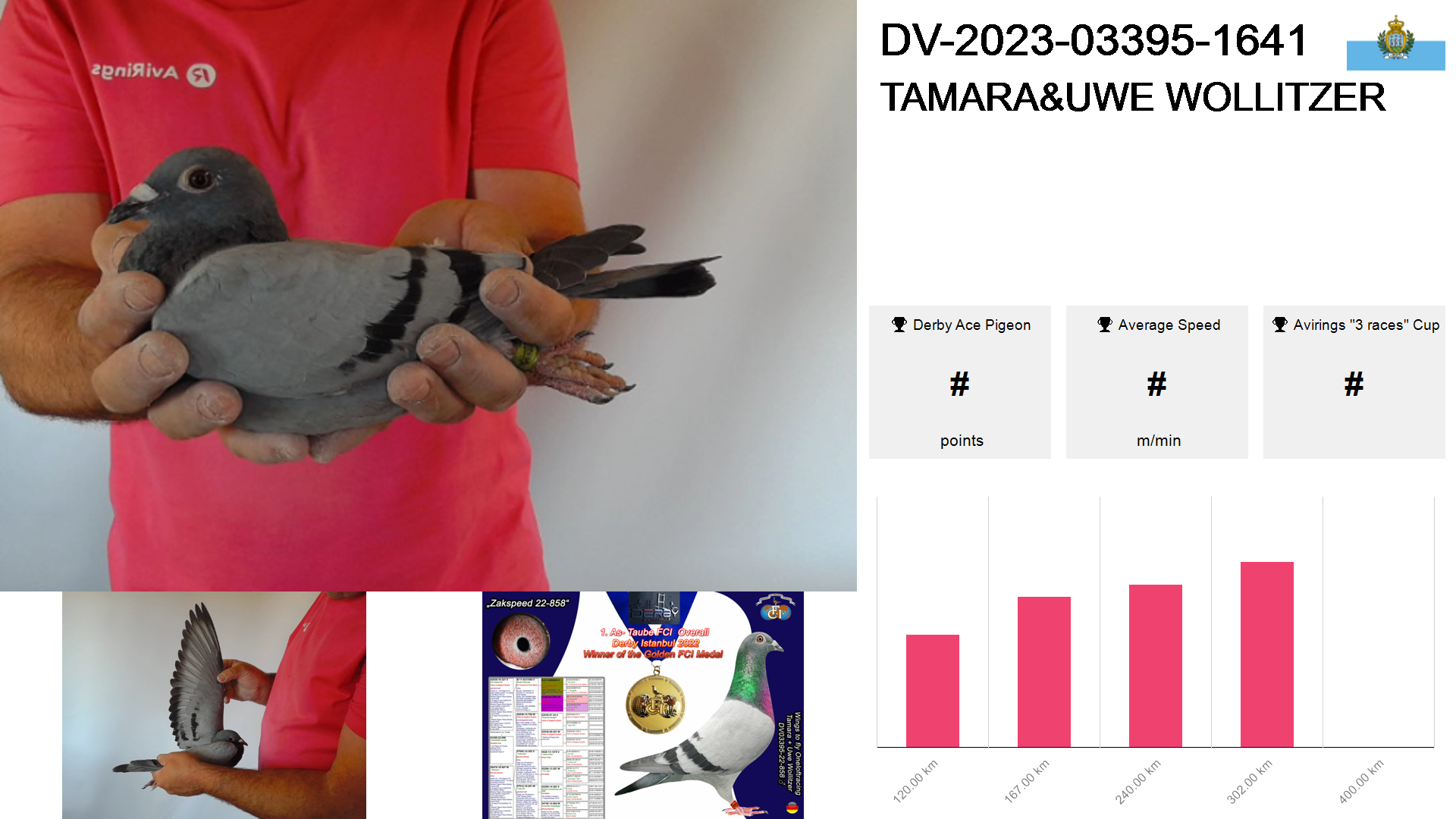 | Race | Position | Number of pigeons | Percent | Speed | Distance |