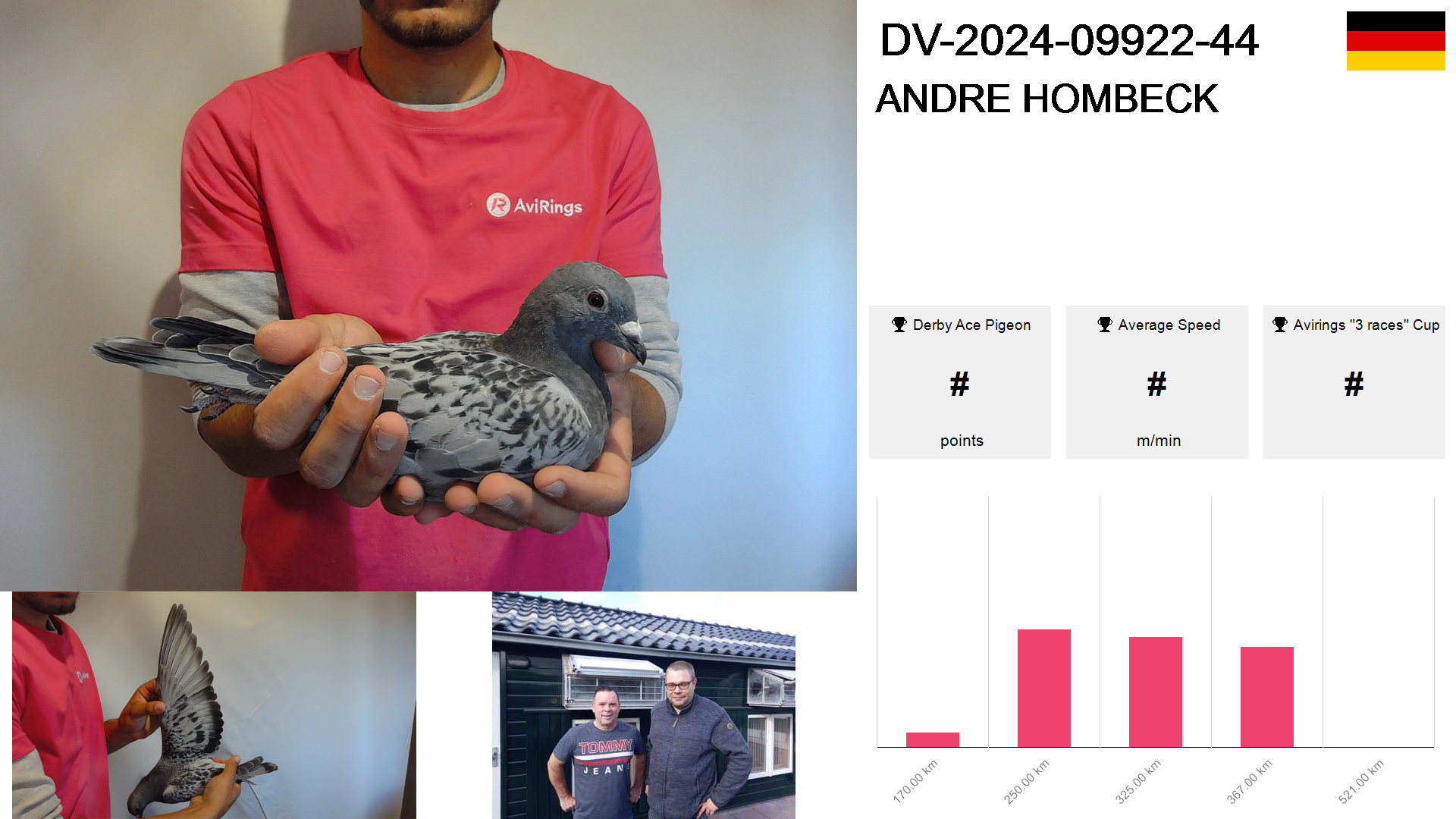 | Race | Position | Number of pigeons | Percent | Speed | Distance |