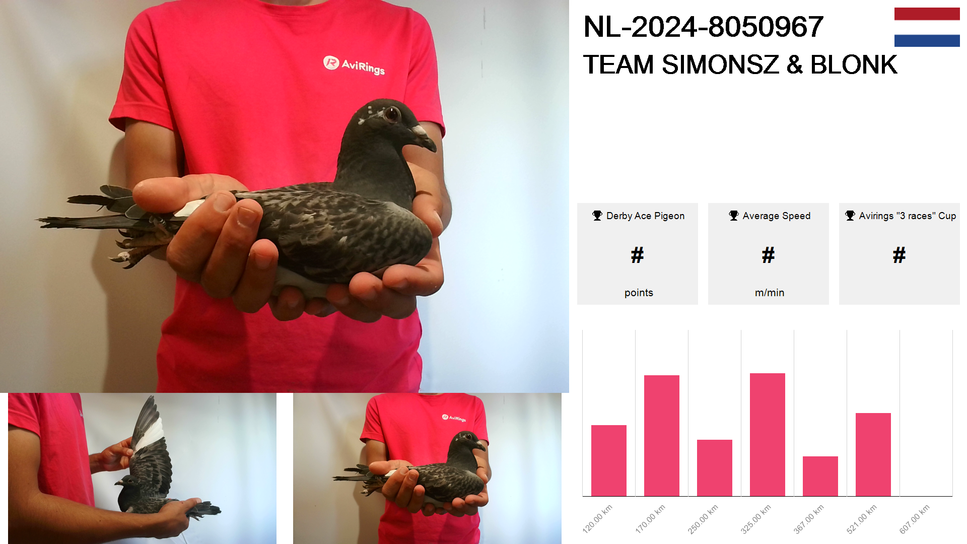 | Race | Position | Number of pigeons | Percent | Speed | Distance |