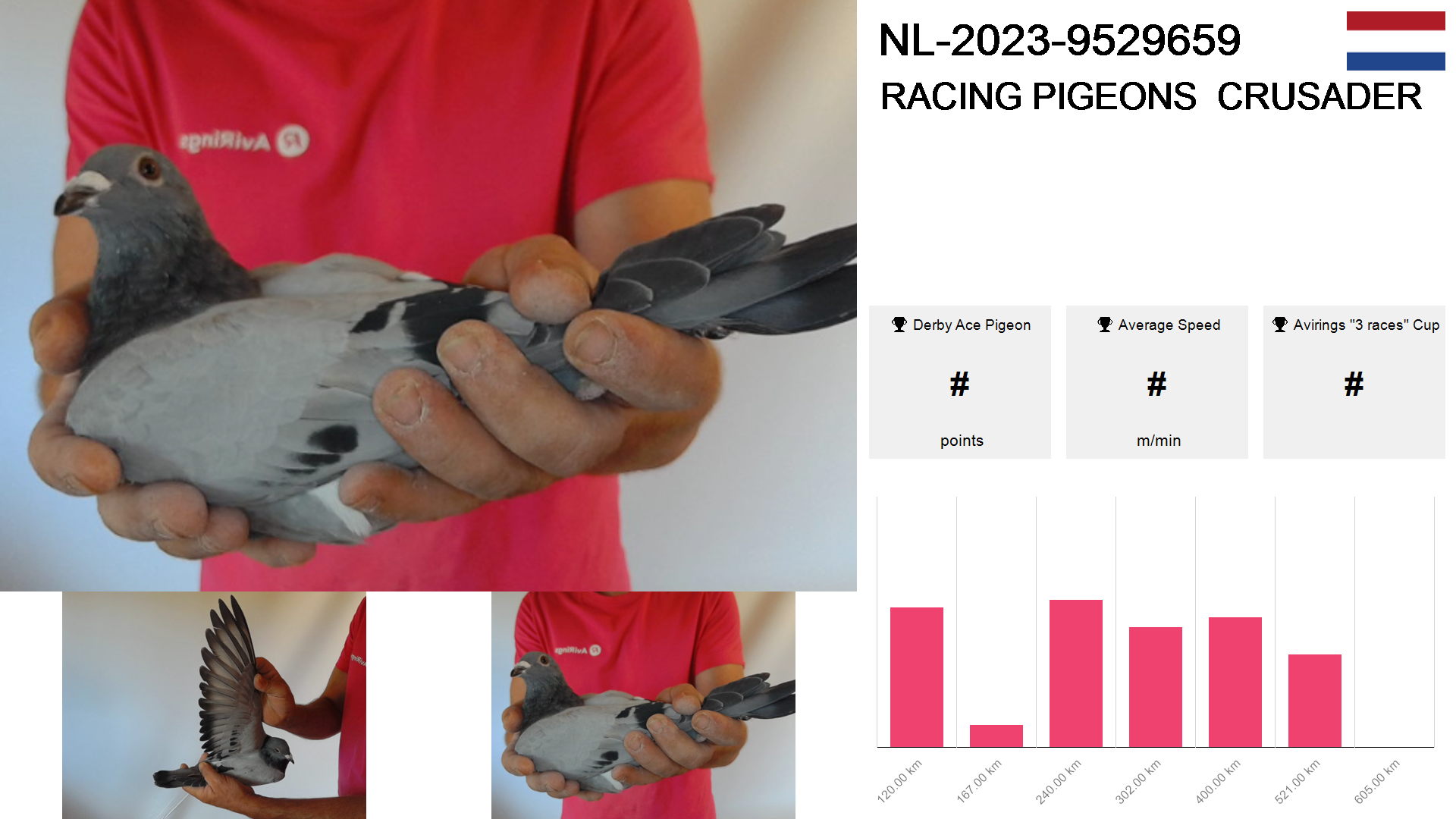 | Race | Position | Number of pigeons | Percent | Speed | Distance |