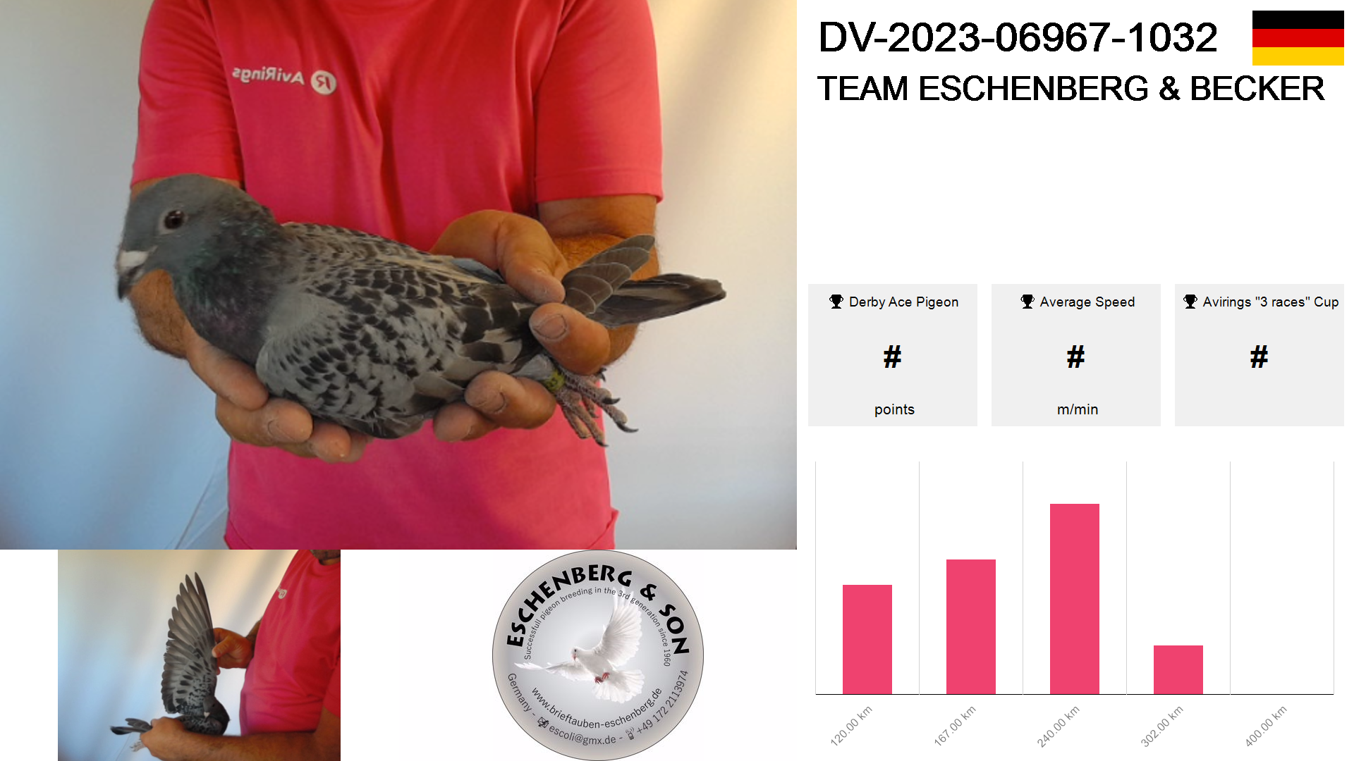 | Race | Position | Number of pigeons | Percent | Speed | Distance |