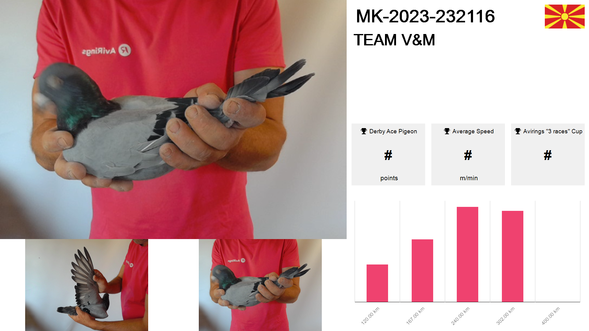 | Race | Position | Number of pigeons | Percent | Speed | Distance |