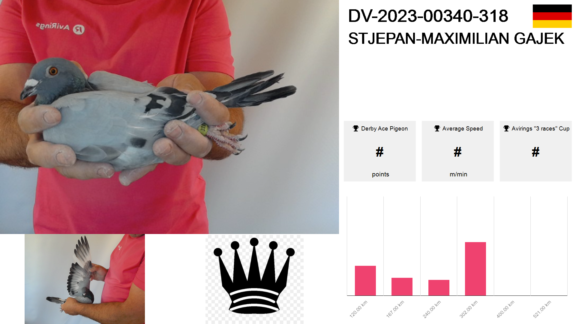 | Race | Position | Number of pigeons | Percent | Speed | Distance |