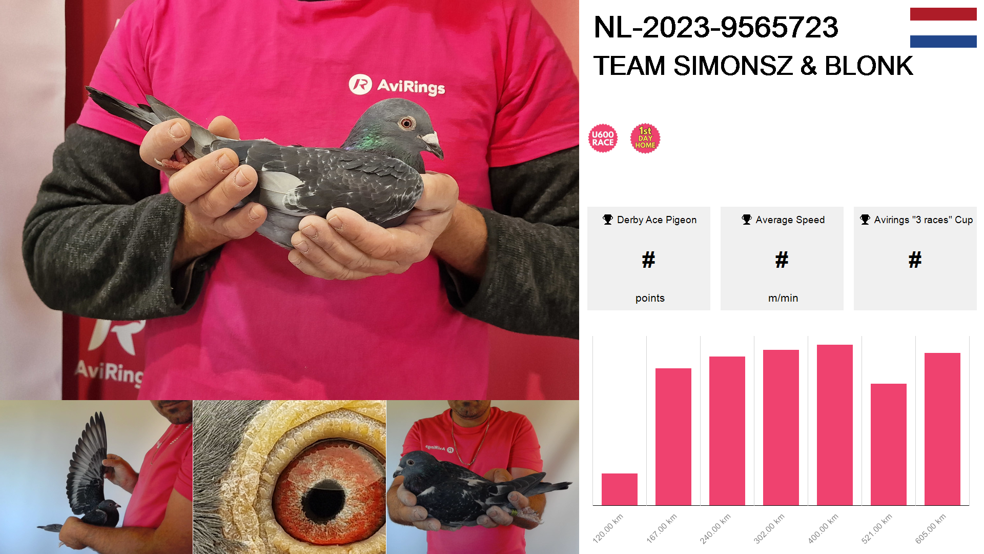 | Race | Position | Number of pigeons | Percent | Speed | Distance |