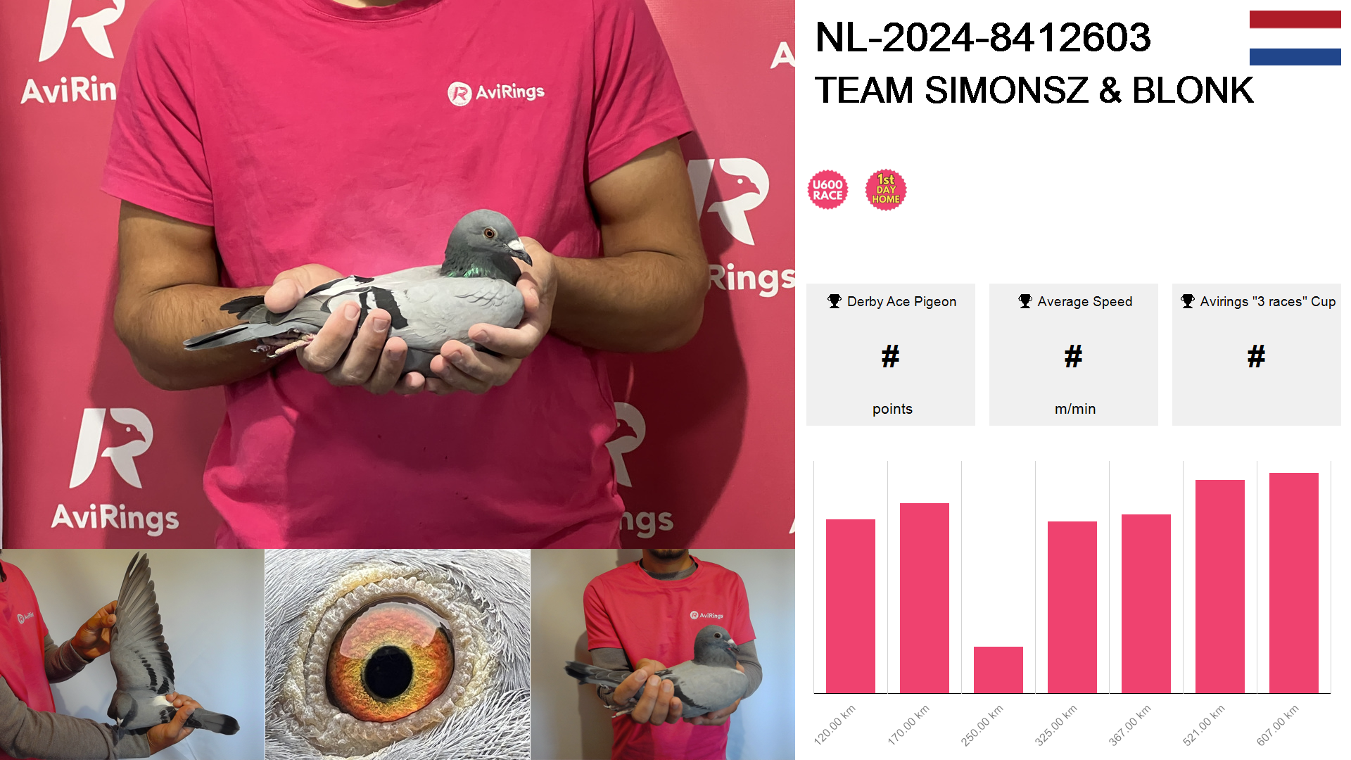 | Race | Position | Number of pigeons | Percent | Speed | Distance |