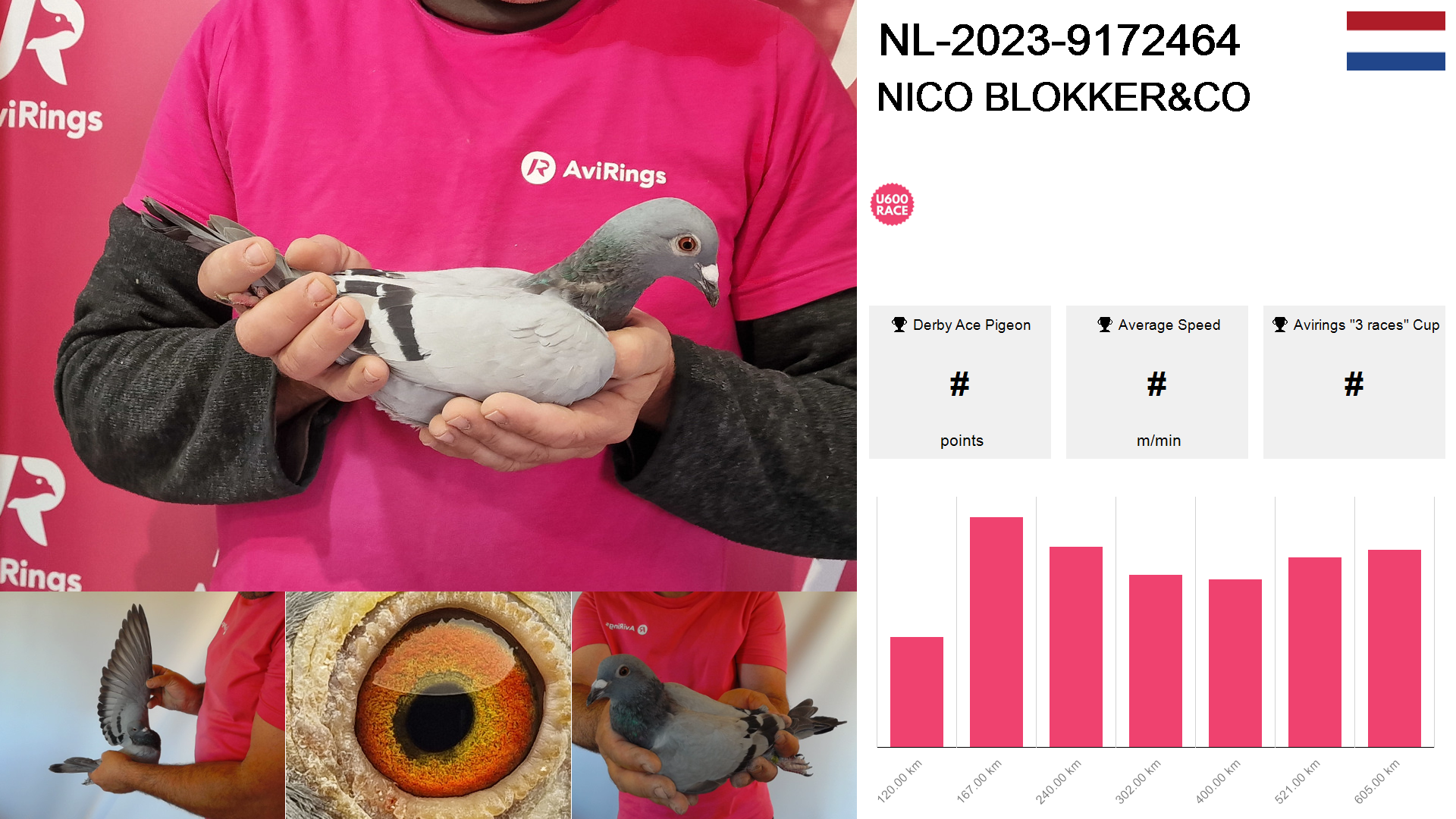 | Race | Position | Number of pigeons | Percent | Speed | Distance |