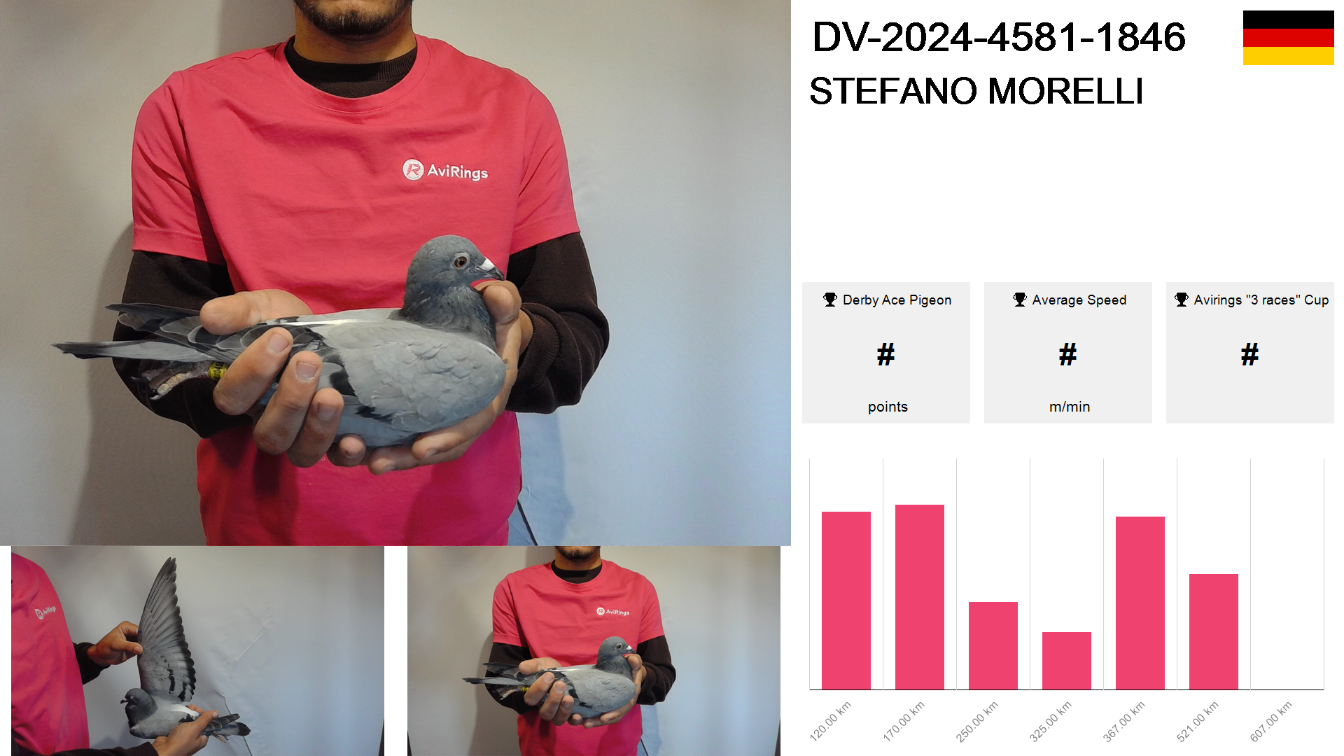 | Race | Position | Number of pigeons | Percent | Speed | Distance |