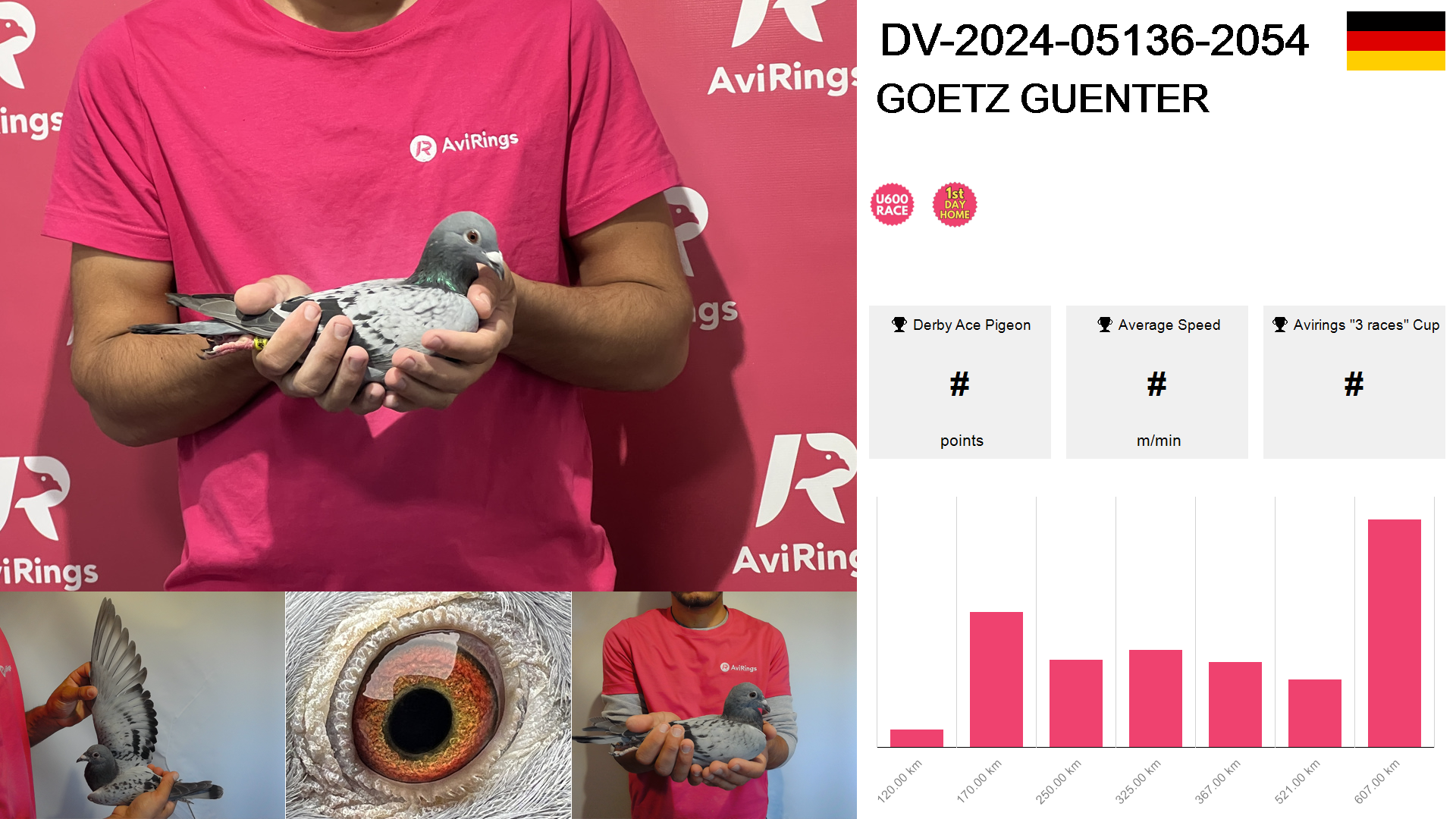 | Race | Position | Number of pigeons | Percent | Speed | Distance |