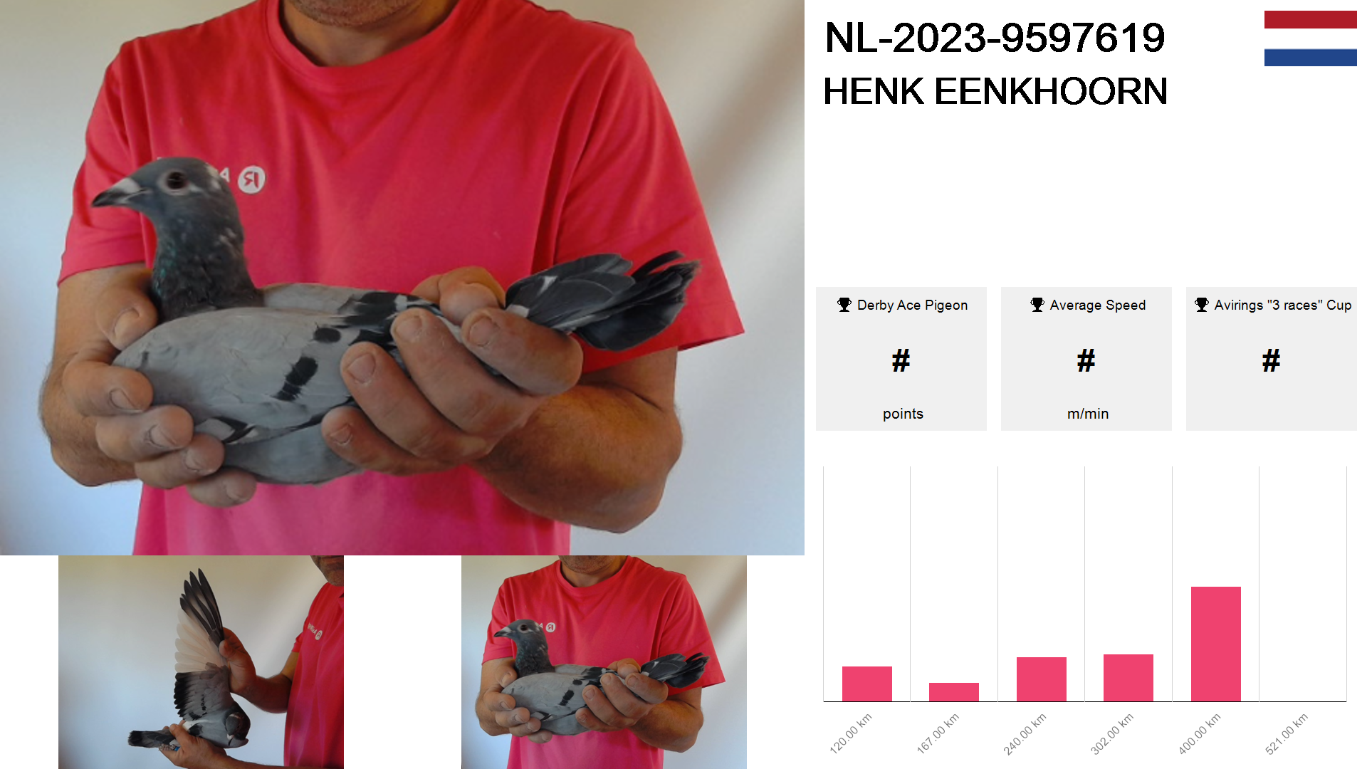 | Race | Position | Number of pigeons | Percent | Speed | Distance |