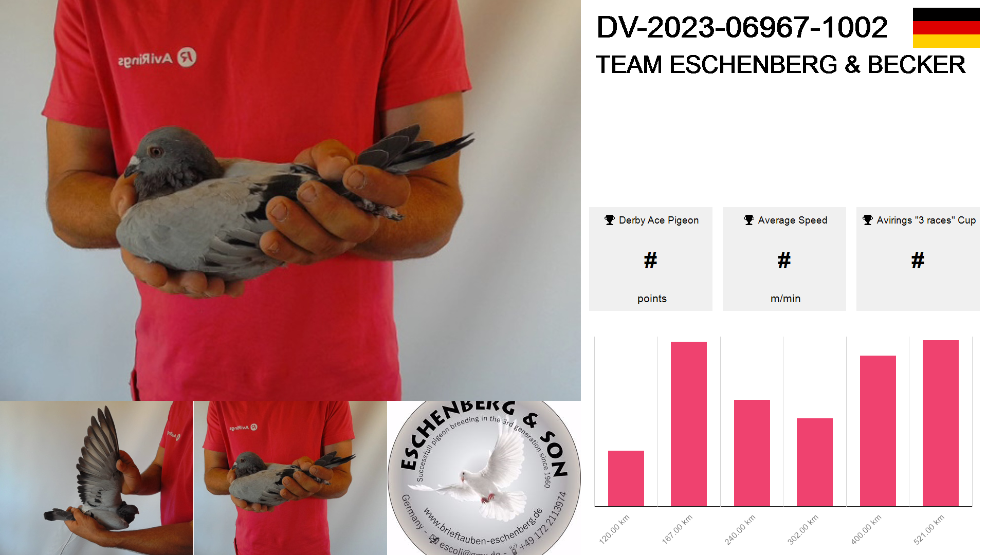 | Race | Position | Number of pigeons | Percent | Speed | Distance |