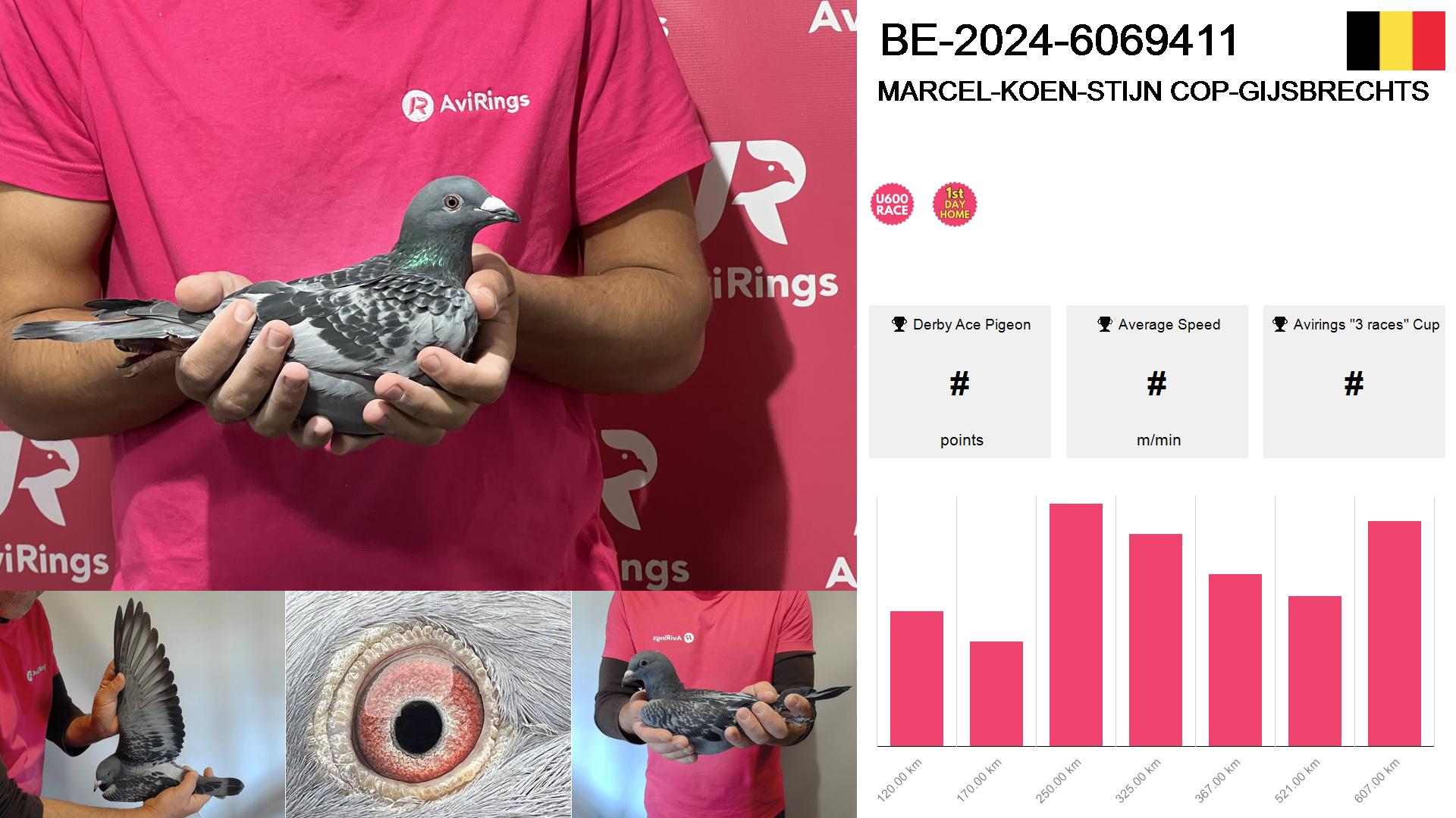 | Race | Position | Number of pigeons | Percent | Speed | Distance |