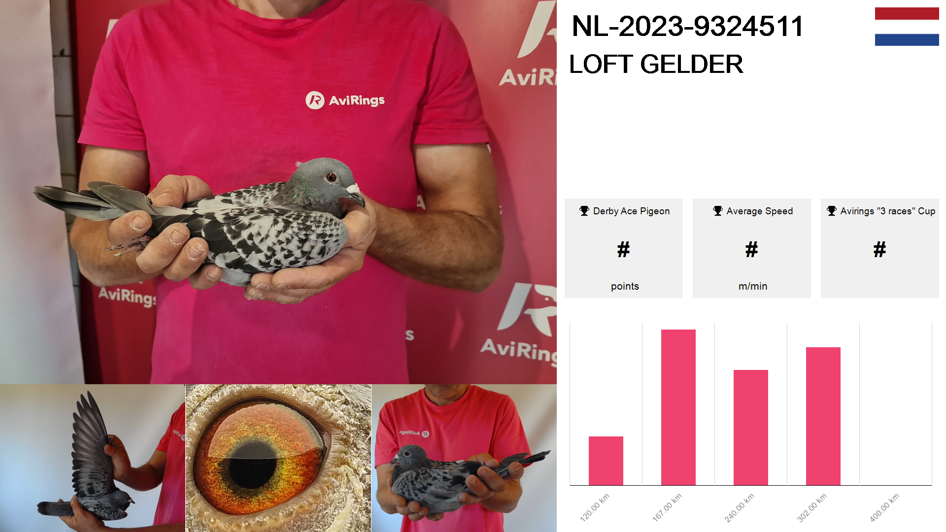 | Race | Position | Number of pigeons | Percent | Speed | Distance |