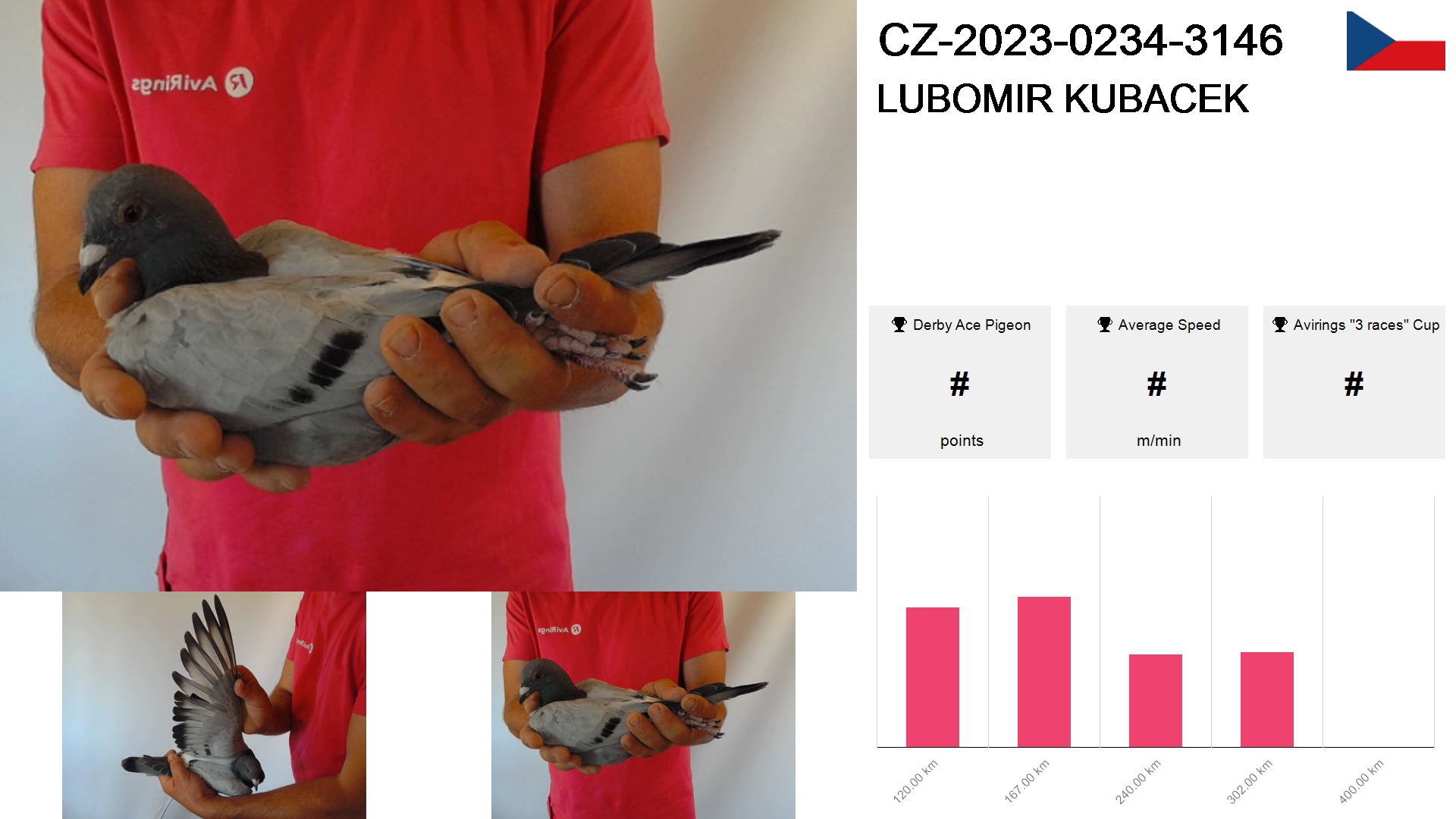| Race | Position | Number of pigeons | Percent | Speed | Distance |