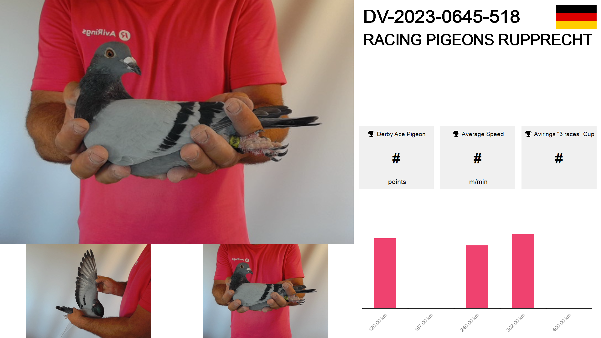 | Race | Position | Number of pigeons | Percent | Speed | Distance |