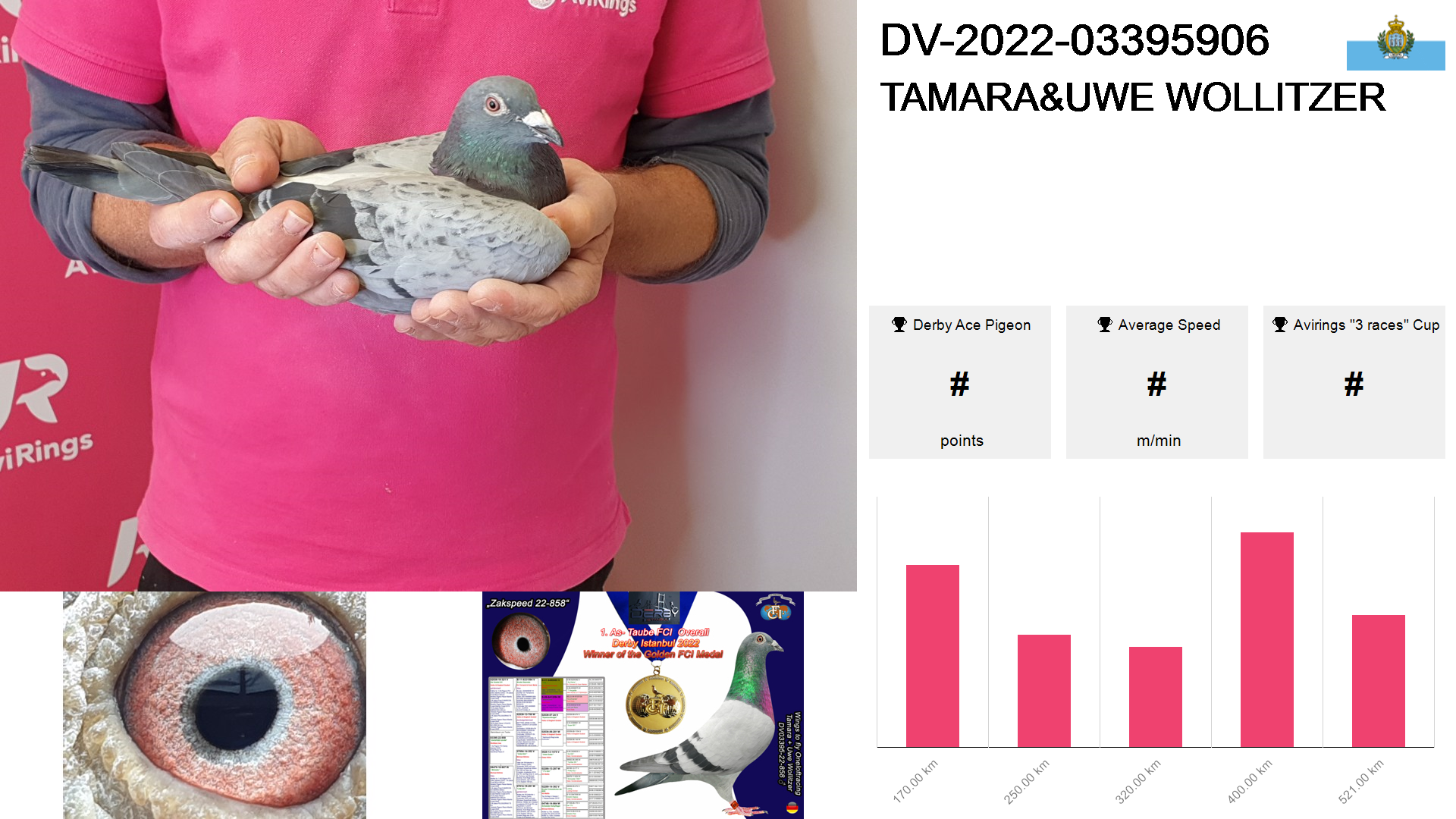 | Race | Position | Number of pigeons | Percent | Speed | Distance |