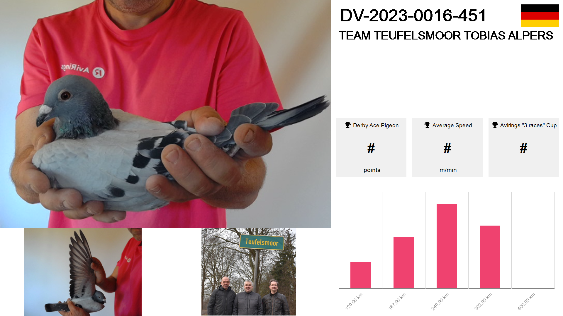 | Race | Position | Number of pigeons | Percent | Speed | Distance |