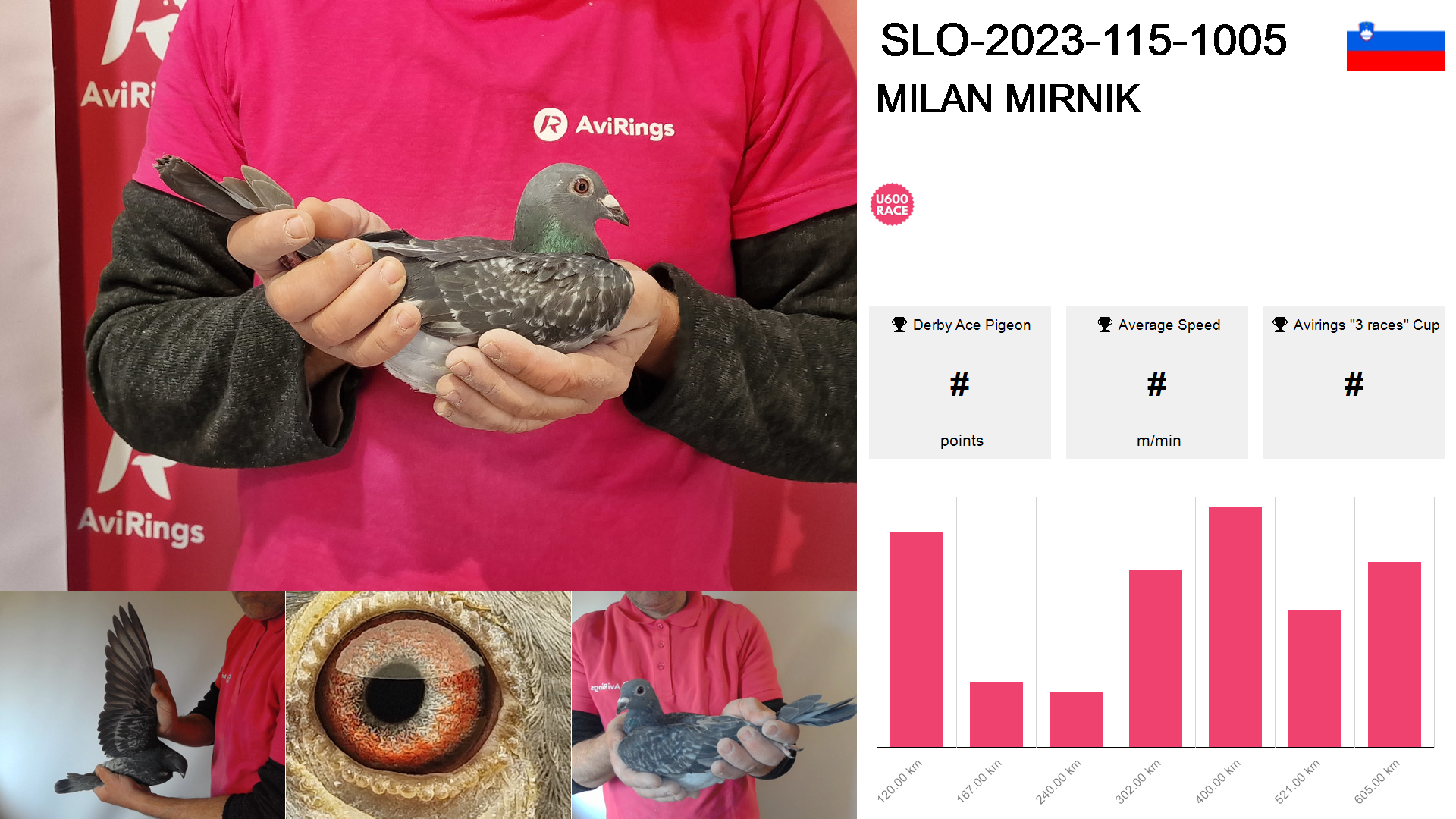 | Race | Position | Number of pigeons | Percent | Speed | Distance |