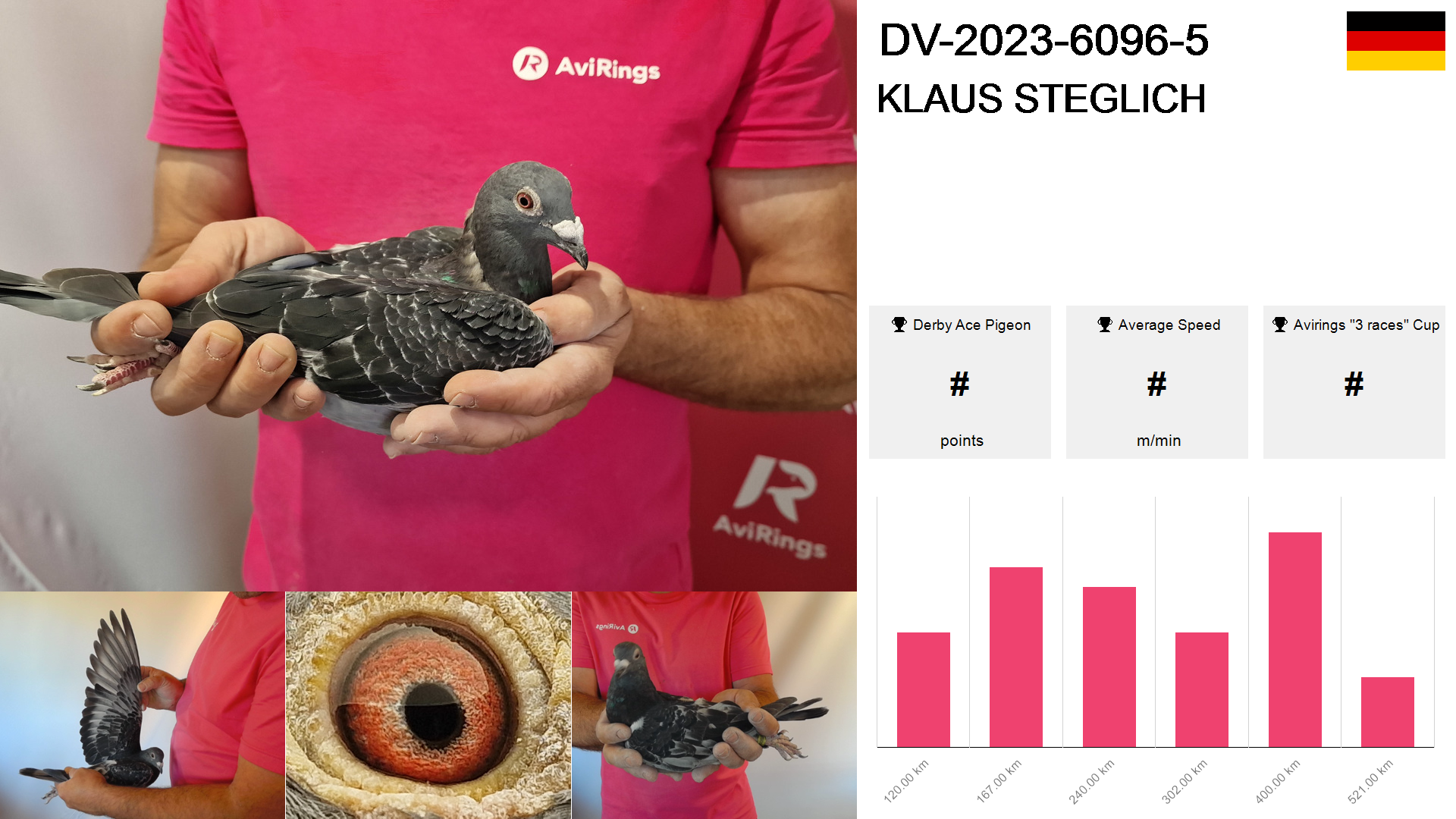 | Race | Position | Number of pigeons | Percent | Speed | Distance |
