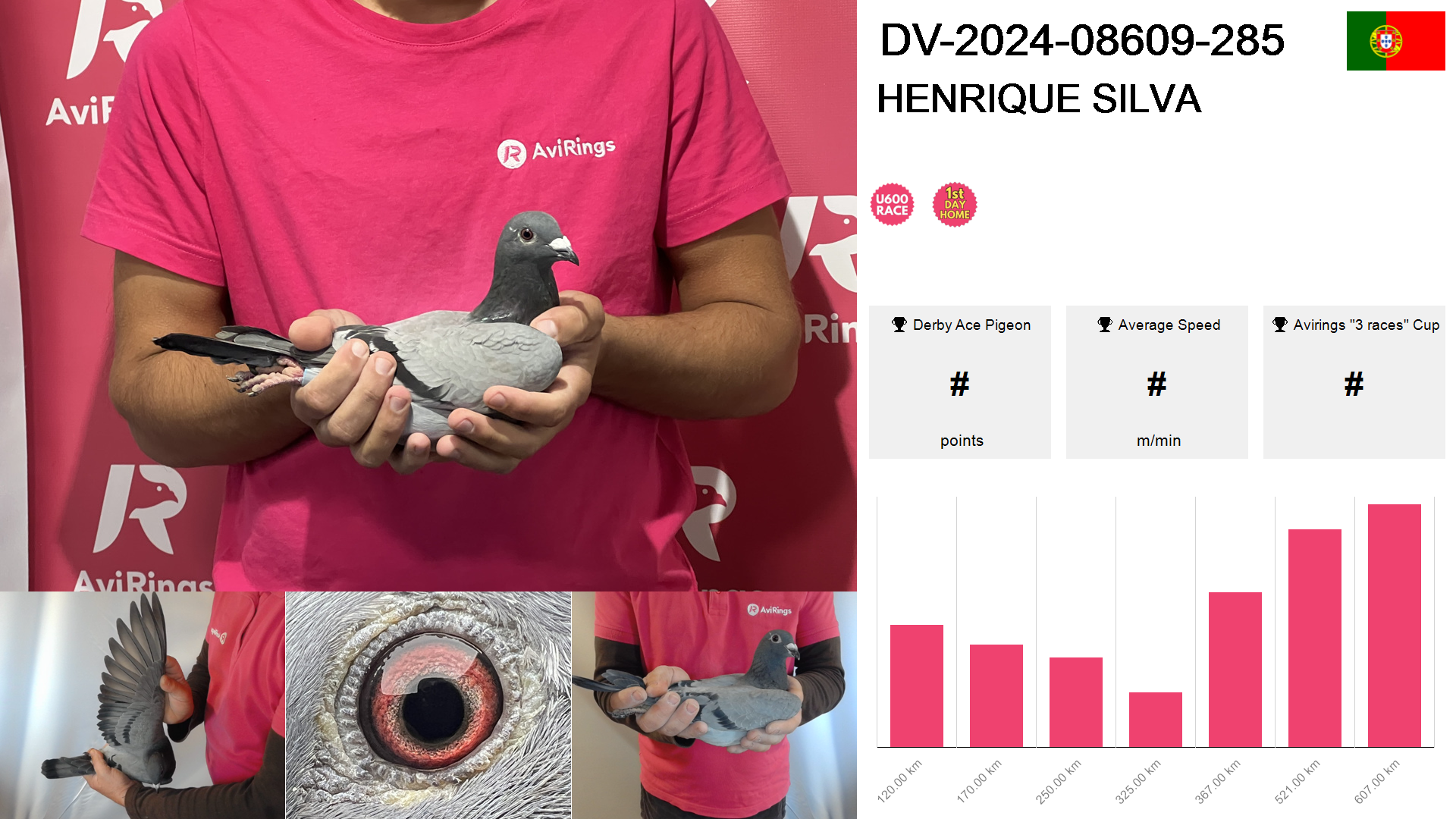 | Race | Position | Number of pigeons | Percent | Speed | Distance |