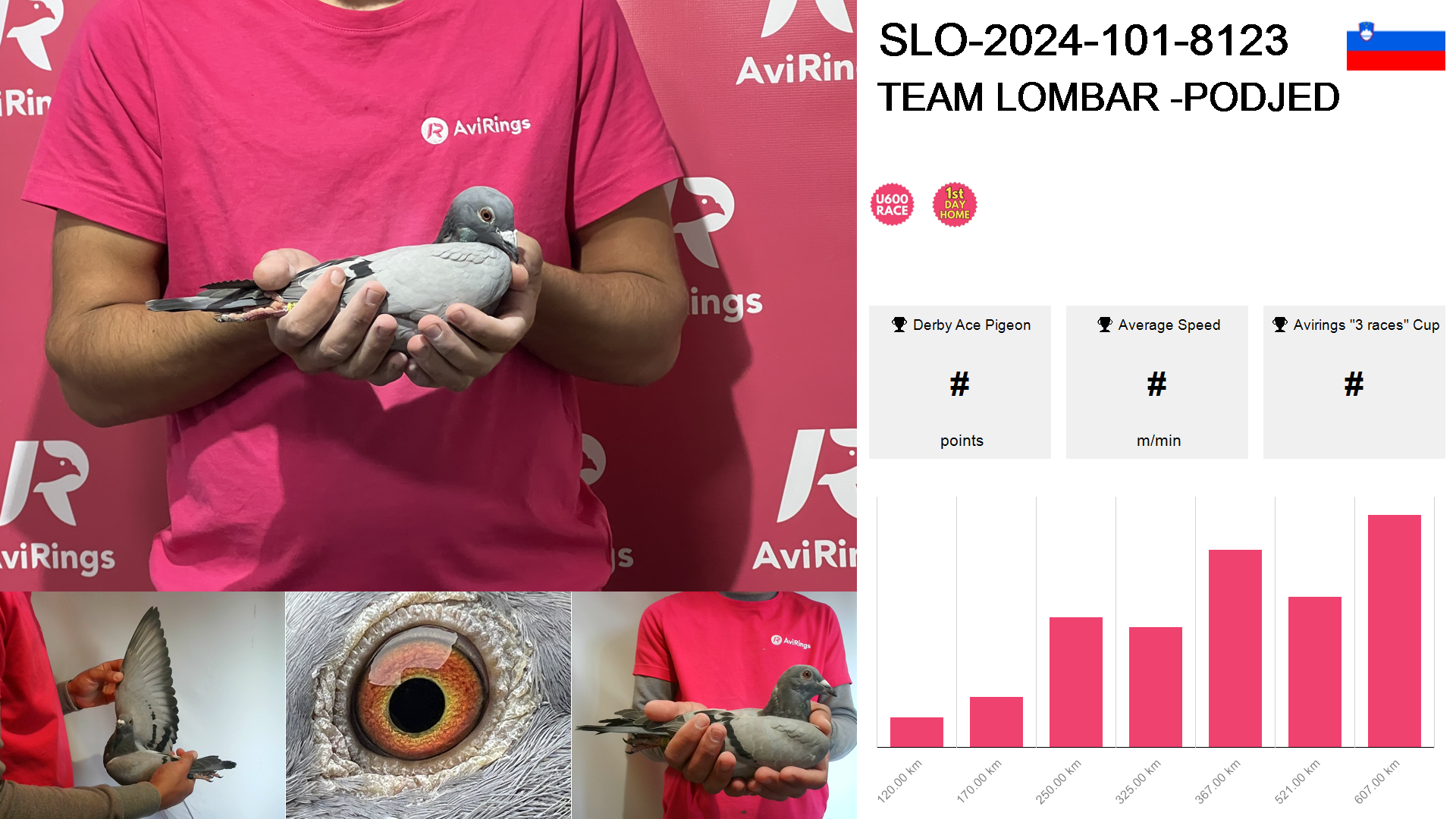 | Race | Position | Number of pigeons | Percent | Speed | Distance |