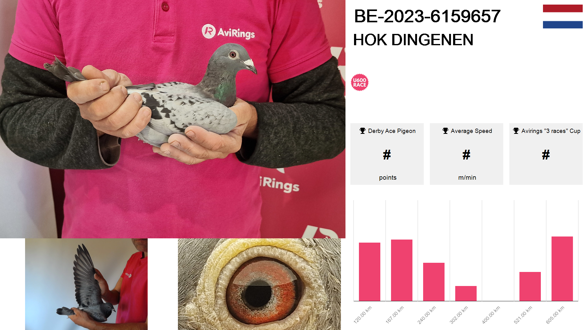 | Race | Position | Number of pigeons | Percent | Speed | Distance |