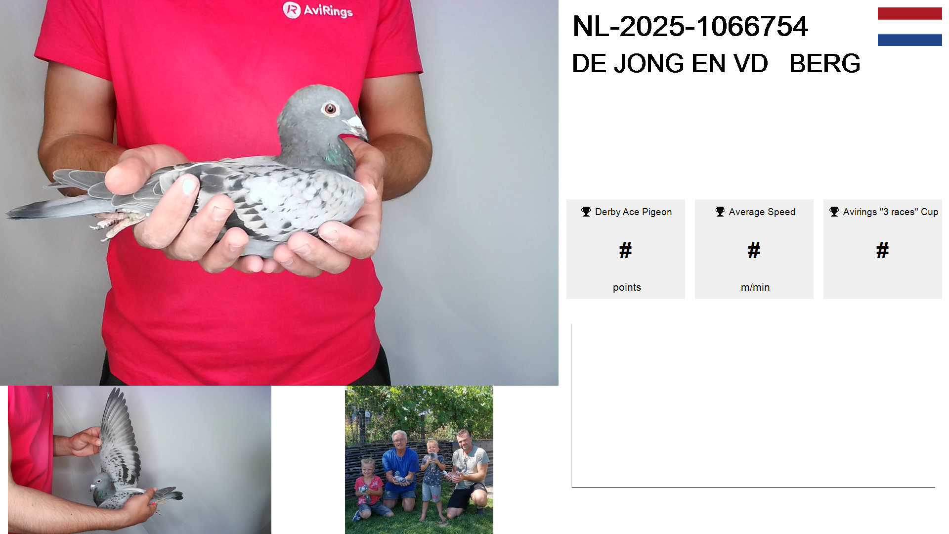 | Race | Position | Number of pigeons | Percent | Speed | Distance |